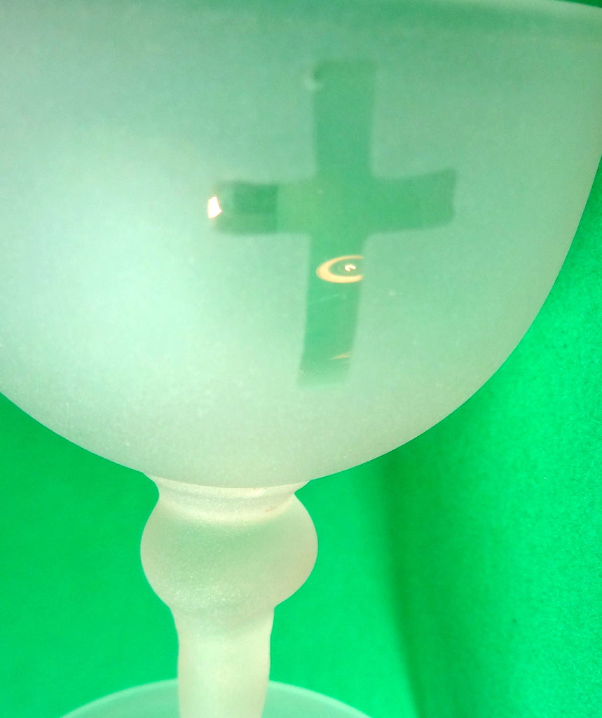 Beskrivelse: Særdeles sjælden særkalk fra Fyens Glasværk. Glasset er fremstillet til kirkebrug, ca. 1920. I Fyens prisbog nr. 3666, side 348 er glasset betegnet som alterkalk, mat med blank kors. Glasset vandt aldrig en plads i de danske kirker, pga glassets skrøbelighed, derfor minimal produktion.