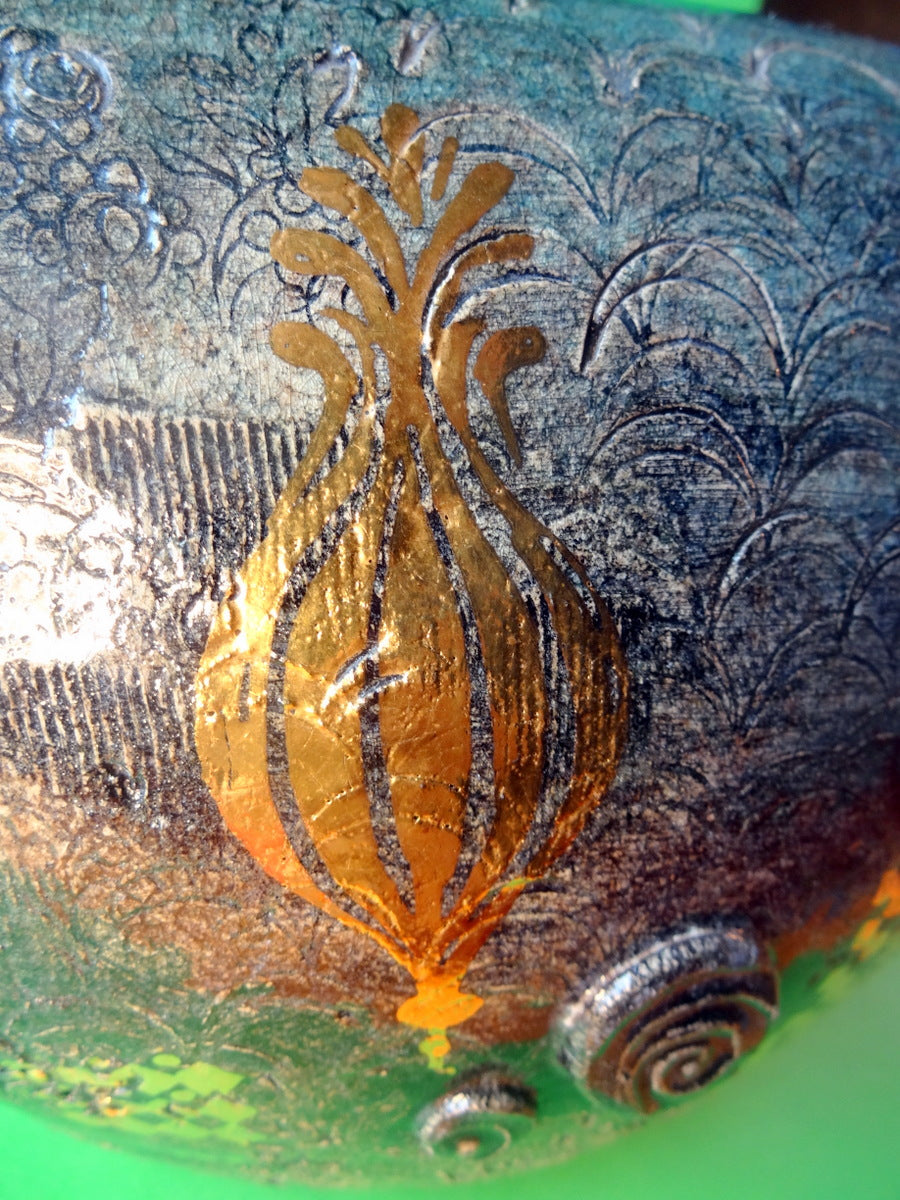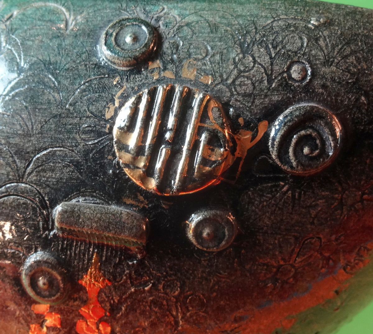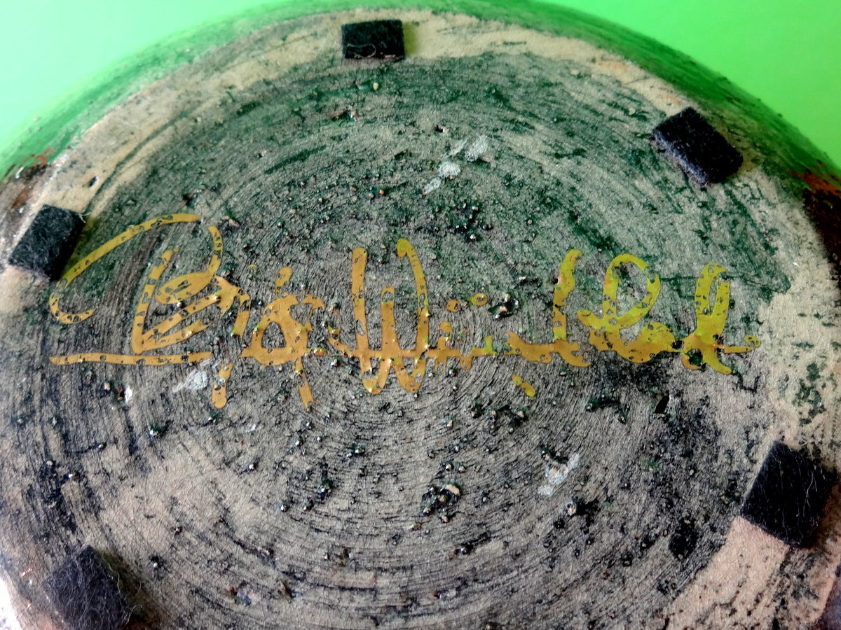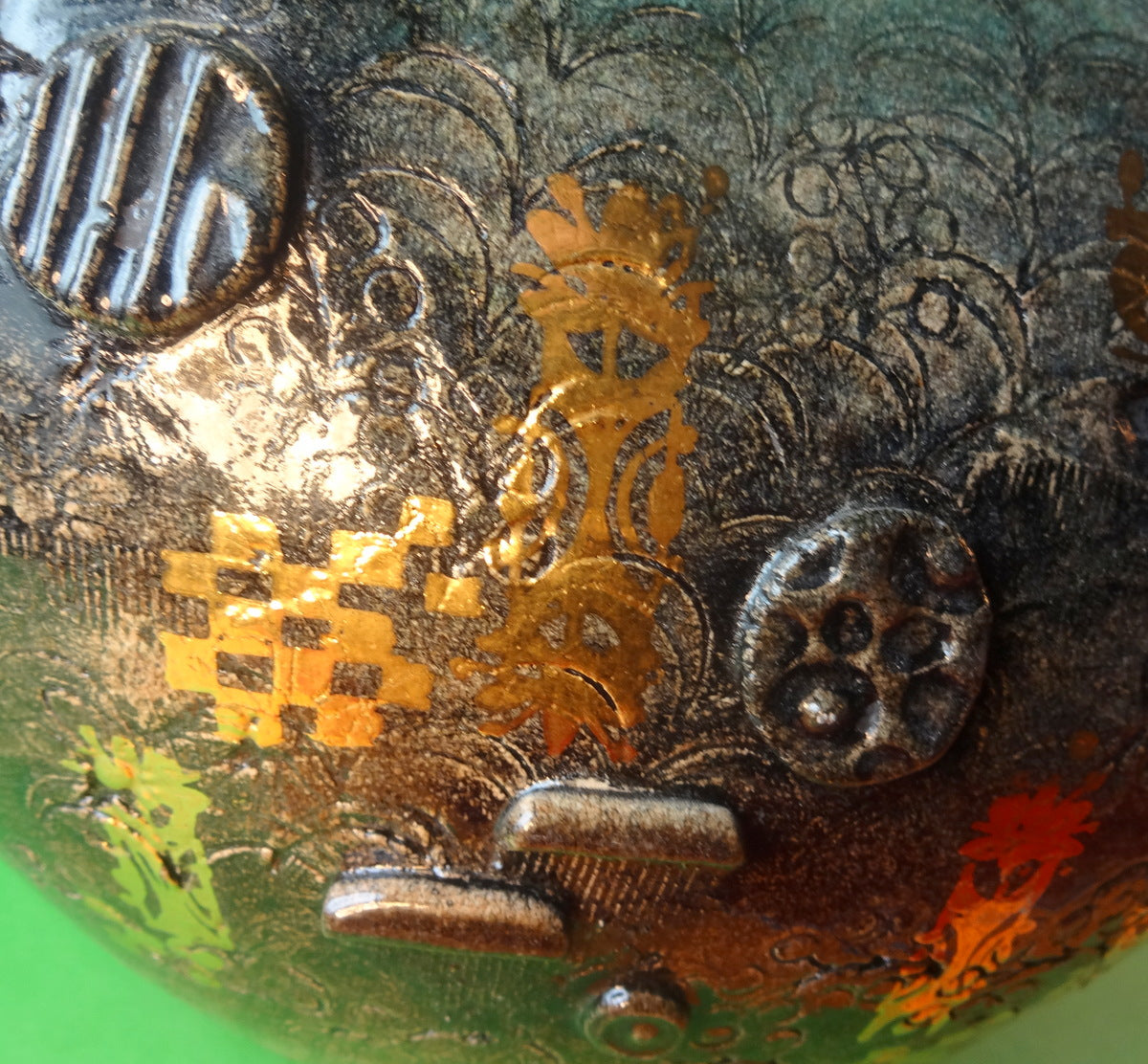 Beskrivelse: Stor jardiniere af grønglaseret keramik, med påmoduleret runde og aflange former. Bemalt med guld. Motiv af luftballoner, tårne og blomster m.m. I keramikkens overflade indridset motiv af talrige blomster m.m. Signeret i bunden. Et af Bjørn Wiinblads mere spændede og vellykkede arbejder.