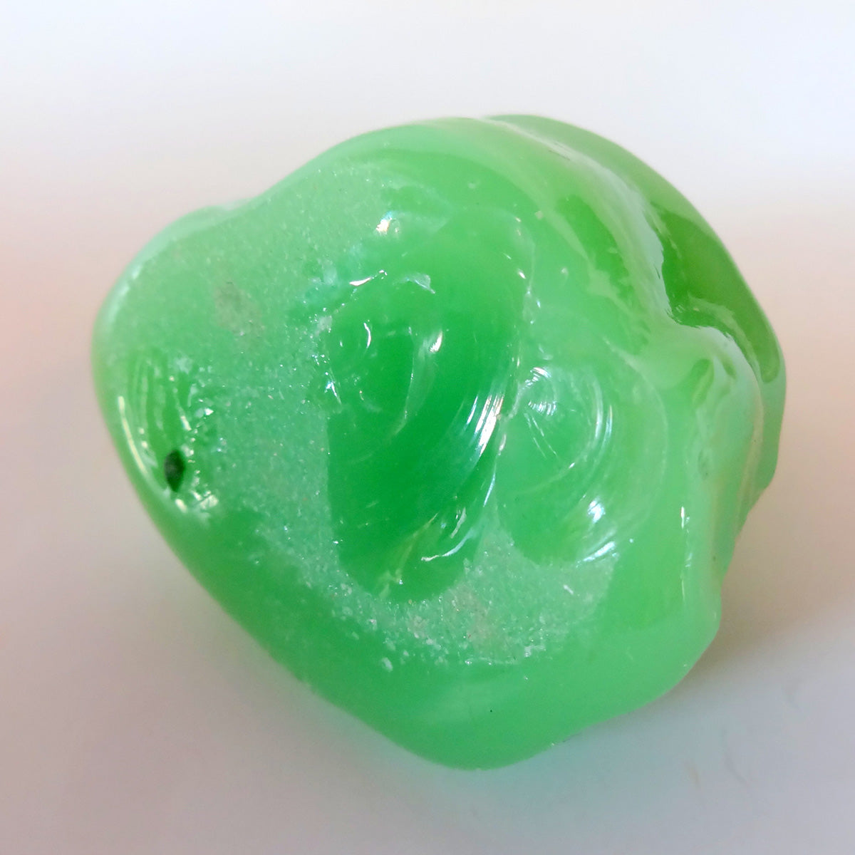 Beskrivelse: Lille kinesisk buddha støbt i pekingglas. Figuren er afbrækket i bunden og fremstår i klassisk jade farve.