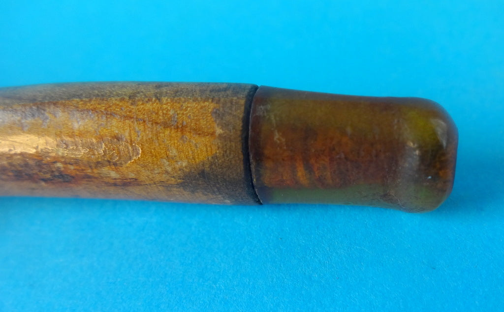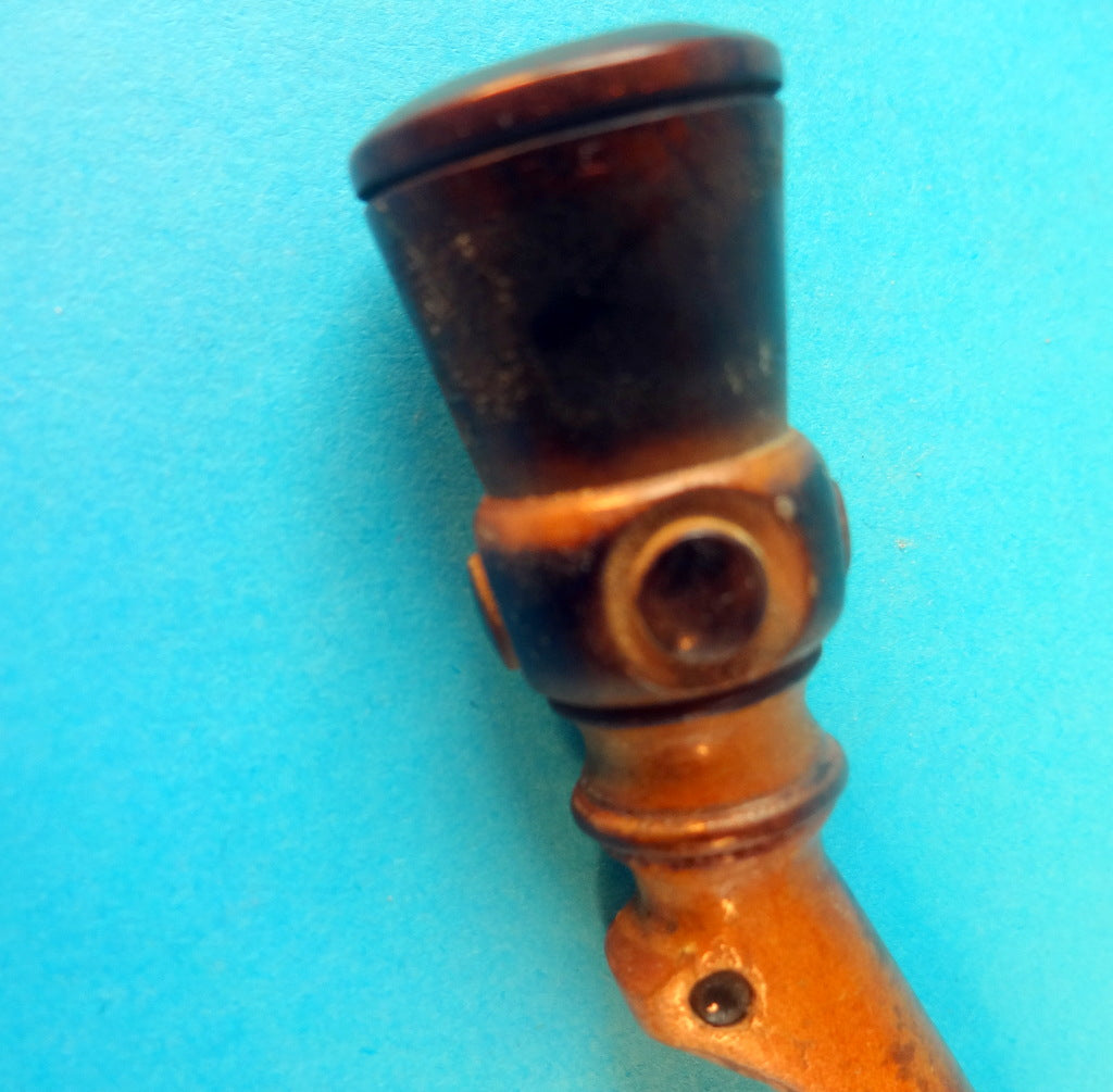 Beskrivelse: Cerutrør af udskåret træ, med rav mundstykke. På siden monteret linsesystem med diapositiv billede forestillende kvinde. Tidlig pornografi.