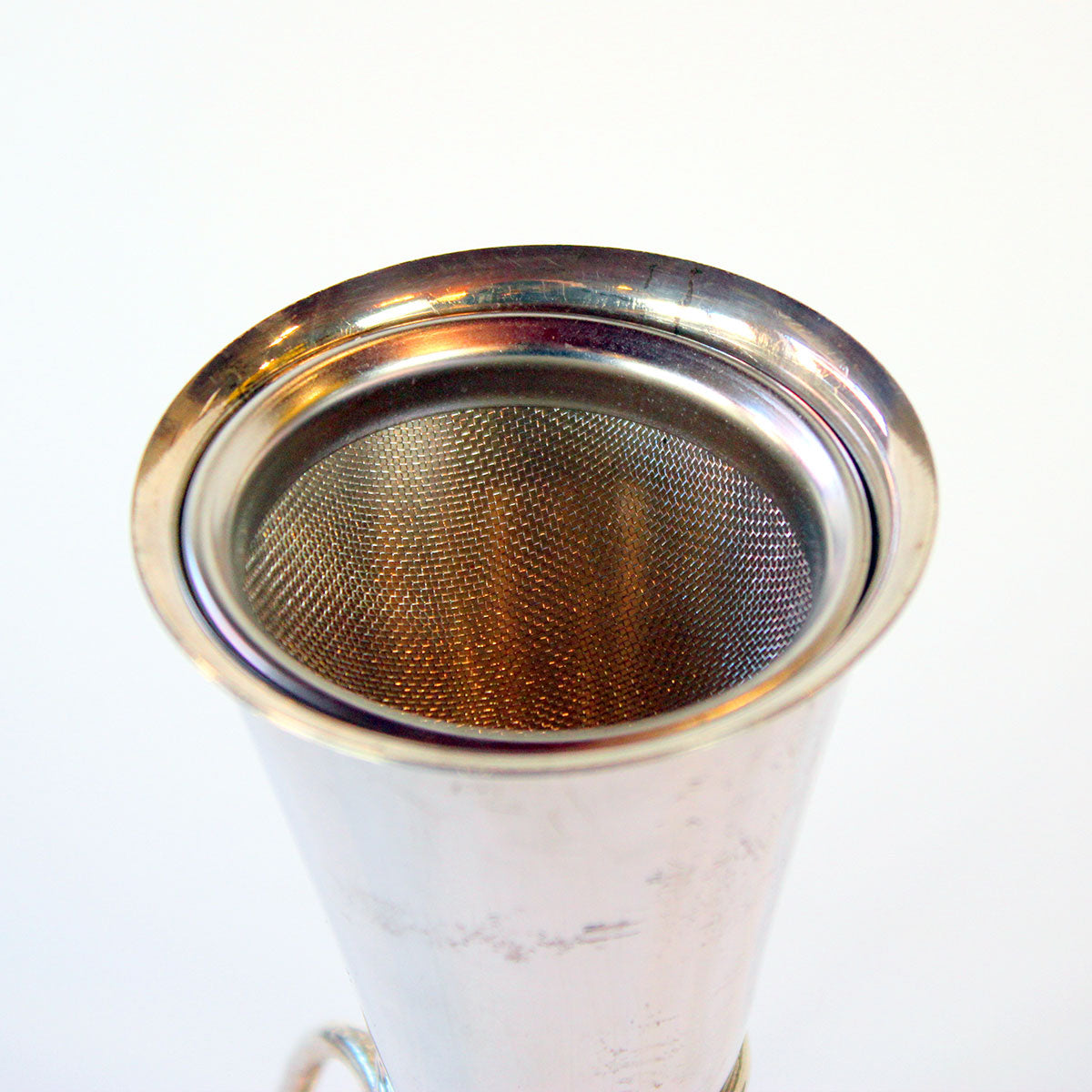 Beskrivelse: Dekanteringstragt til vin bestående af tragt med huller i bund samt vinspreder og filter, fremstillet i sølvplet. Tilhørende holder med lille drypbakke.