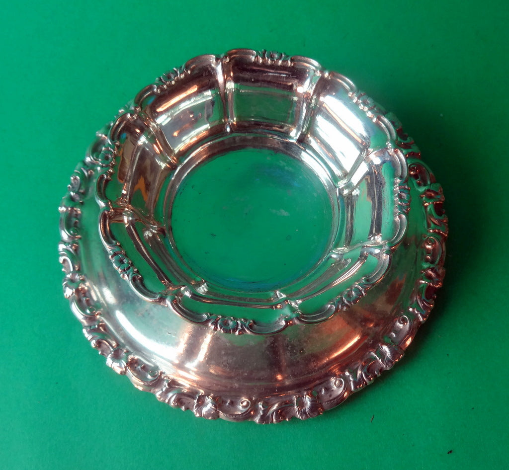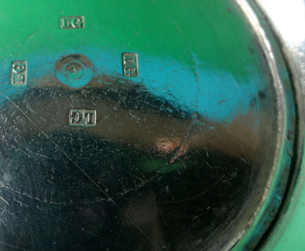 Beskrivelse: Saltkar med påloddet underdel, ligeknækket. Rokoko form. I bund fire stempler.
