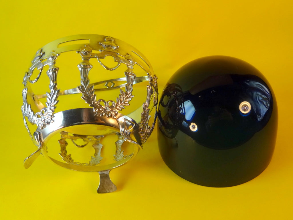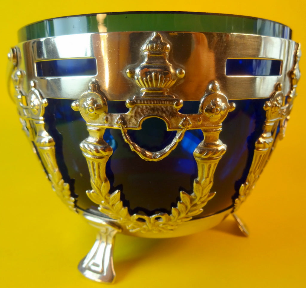 Beskrivelse: Sukkerskål i empire mønster, af sølvplet med indsats af mundblæst blå glasskål. H: 8,5 cm