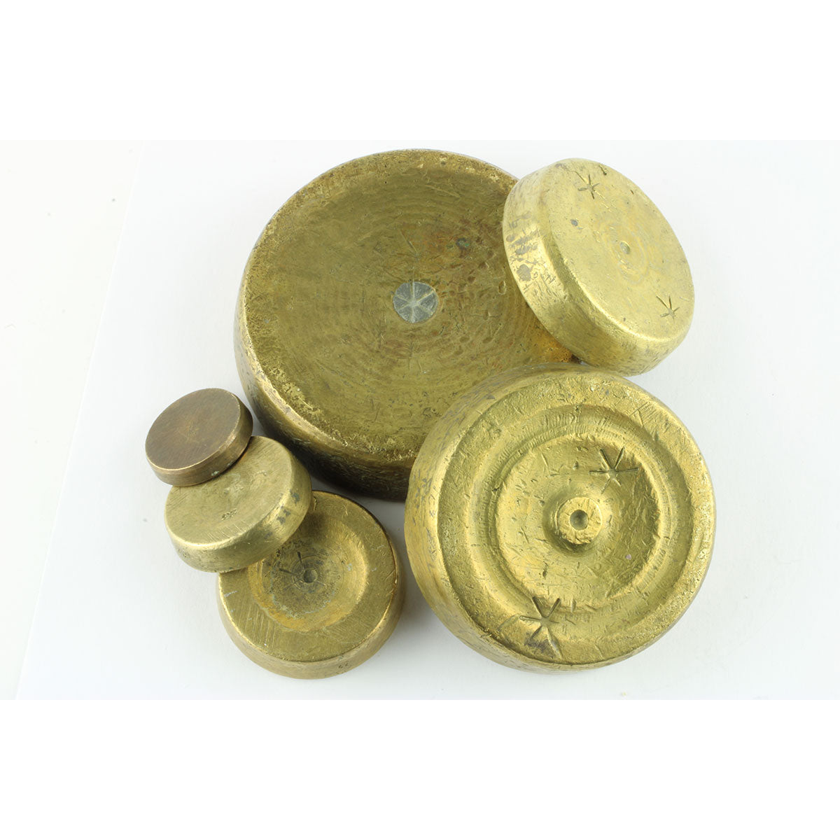 Beskrivelse: En samling engelske vægtlodder fremstillet af messing fra ca. 1925 bestående af seks lodder ounces. Samlet vægt 888 gr.