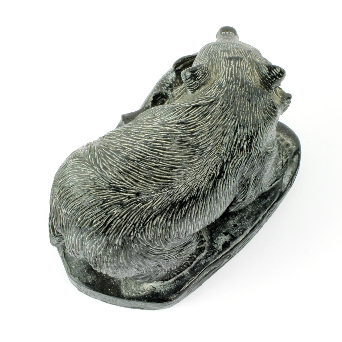 Beskrivelse: Figur fremstillet af fedtstenskomposit forestillende bjørn med fang af fisk fra ca. 1970. I bunden har figuren et mærkat med teksten "MADE IN CANADA"