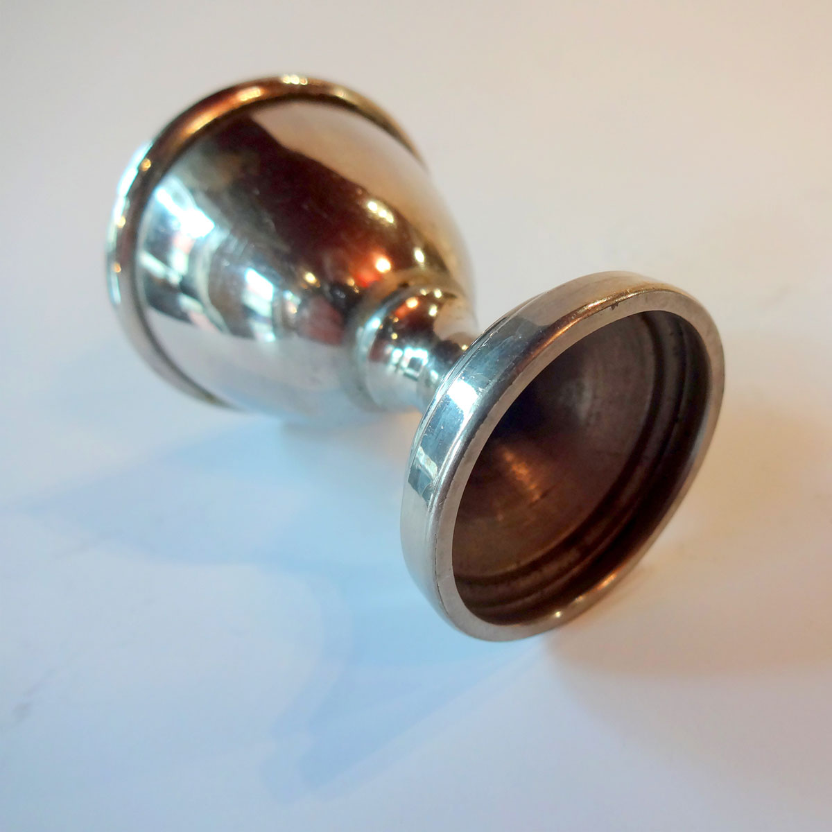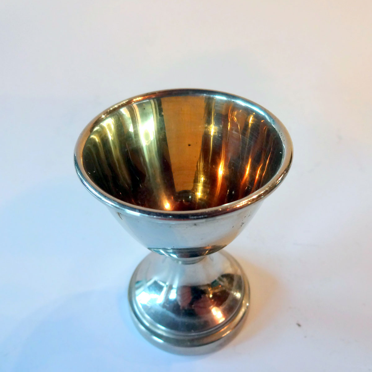 Beskrivelse: Fire æggebæger af hvidligt metal, med indvendig lugeforgyldning fra ca. 1930. Størrelsesmæssigt er de hverken til æg fra struds eller gås, nok nærmere en beskeden høne. Et femte æggebæger kan medfølge gratis, hvis det ønskes.