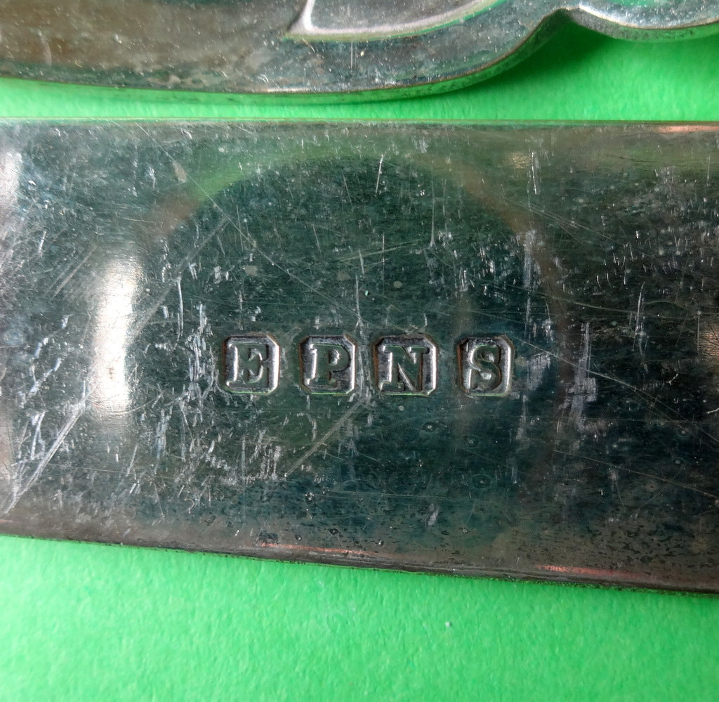 Beskrivelse: Engelsk art deco fiskebestik til seks personer, skafter af rav lign. materiale med forsølvet messing.