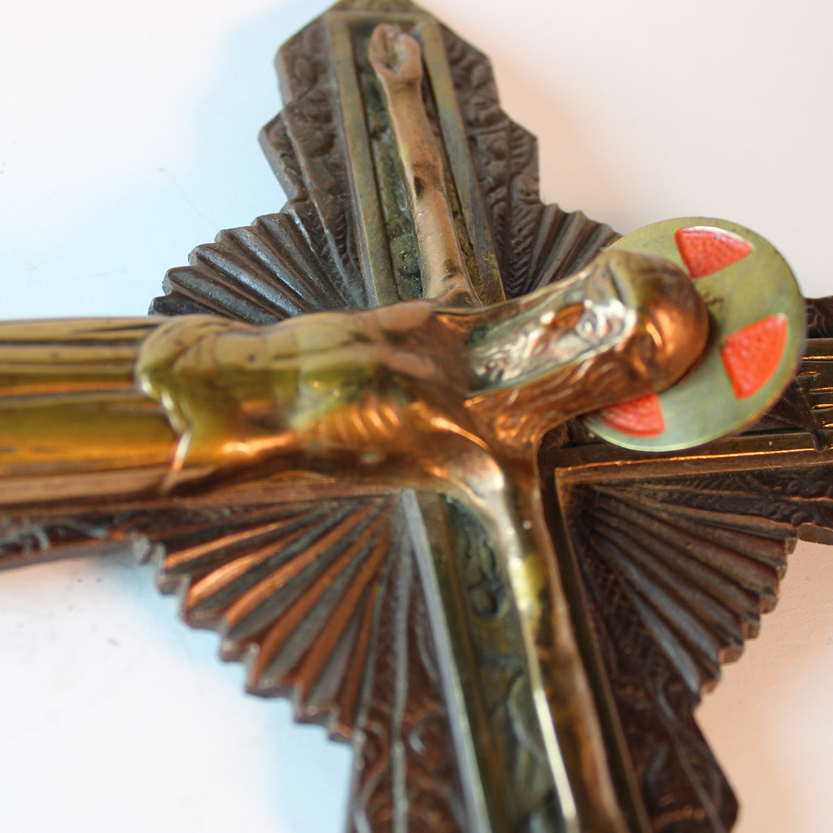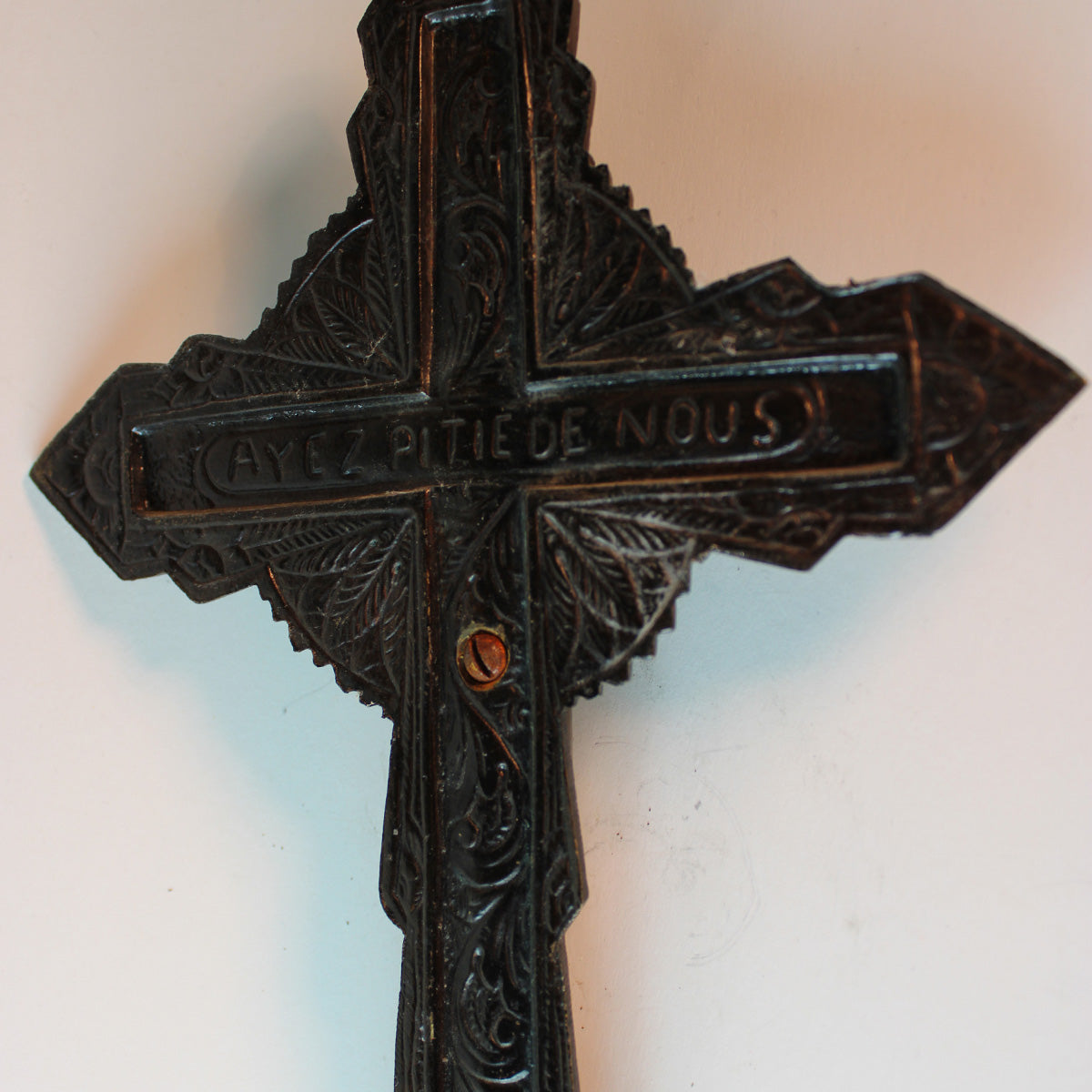 Beskrivelse: Fransk krucifiks med tekst på bagside: "Ayez Pitie De Nous". Fremstillet af bronze.