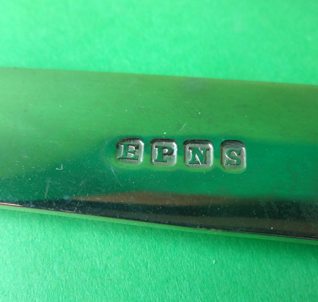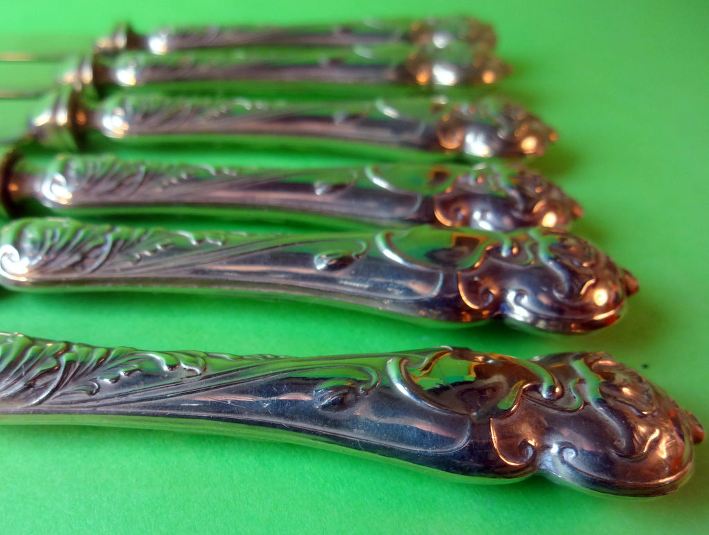 Beskrivelse: Seks engelske frugtknive af forsølvet metal, skafter rococo form. Stemplet EPNS.