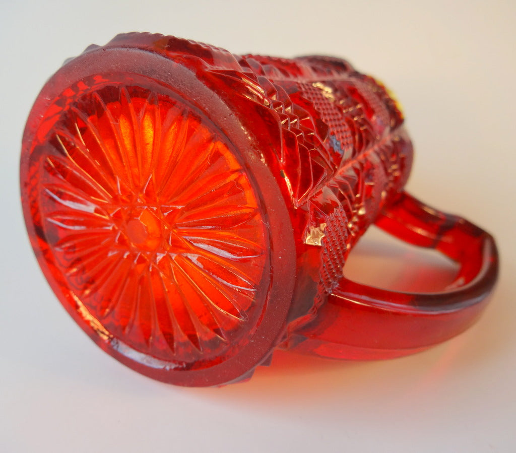 , Årstal: ca. 1920.Beskrivelse: Flødekande af rødt glas fra Fyens Glasværk. Højde: 10,5 cm.