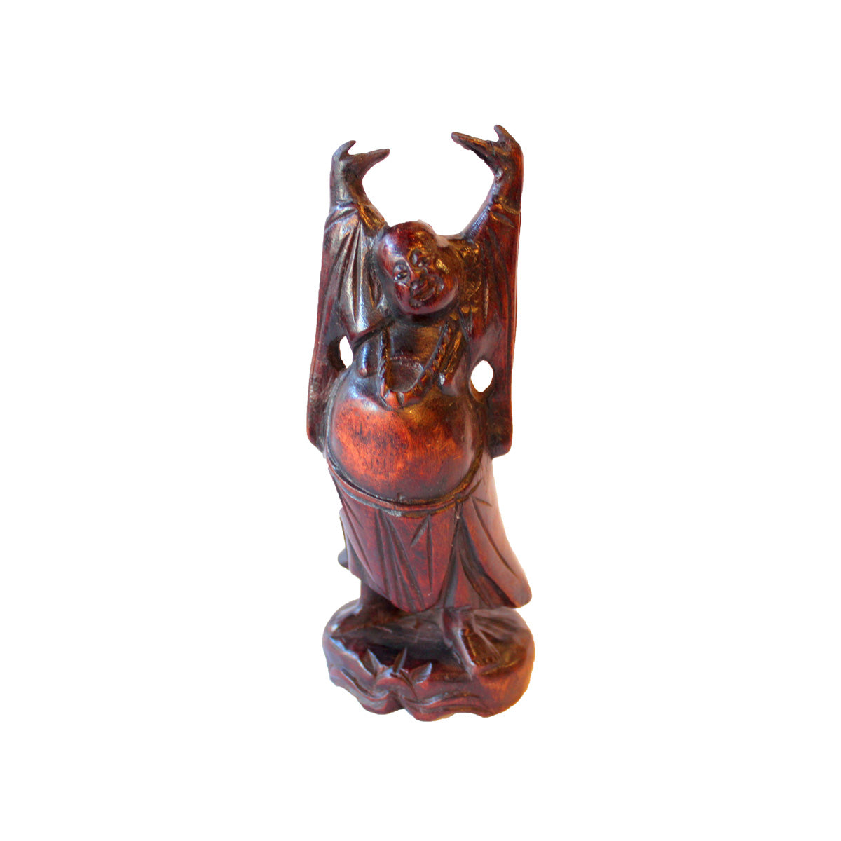 Beskrivelse: Såkaldt happy-buddha skåret af hård træsort, antagelig rosentræ fra Kina. Figuren er fra ca. 1920, og typen blev fremstillet som souvenir dengang. Som en lille kuriosum har han øjne lavet af sort og hvidt glas.