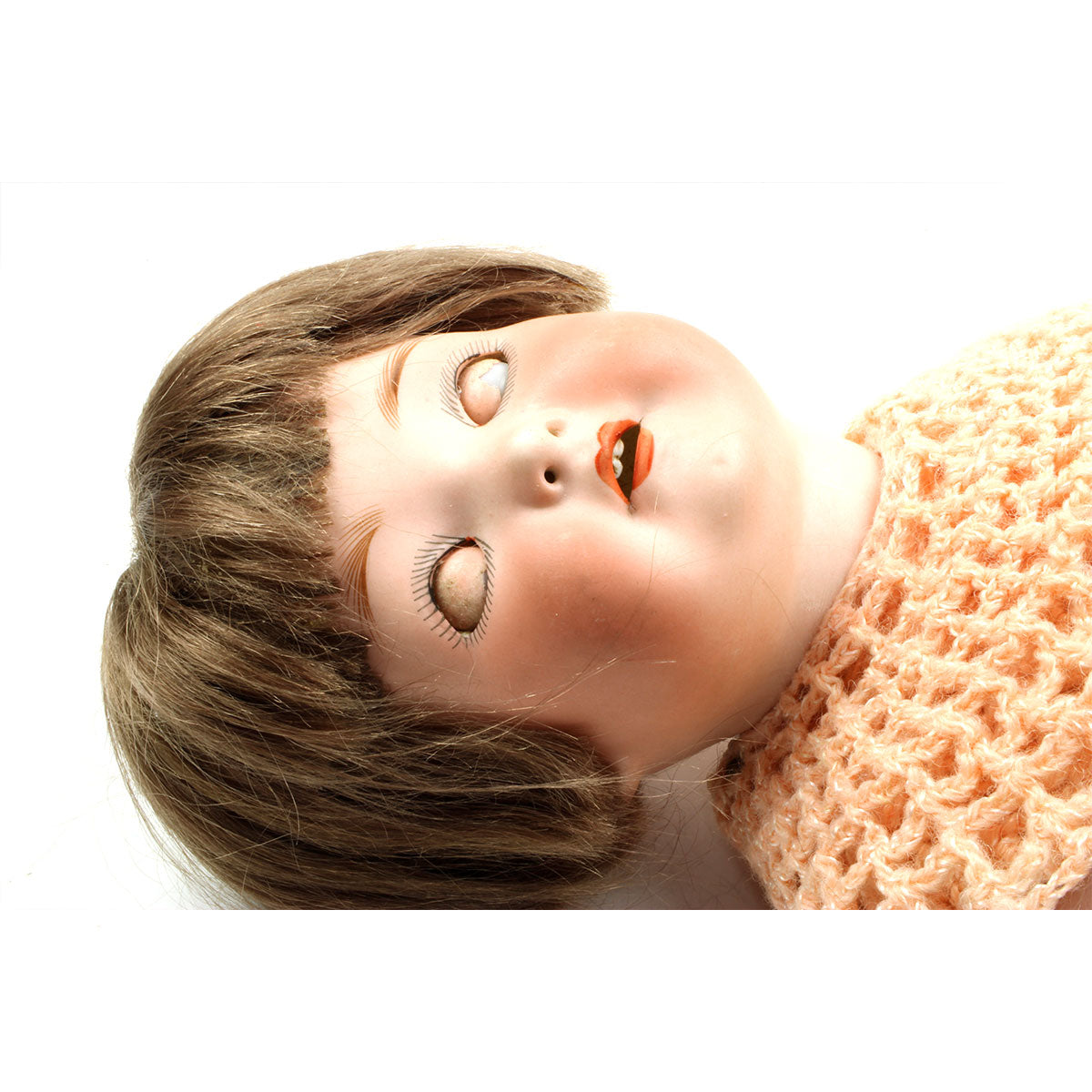 Beskrivelse: Dukke fra firmaet Heubach Köppelsdorf med hoved af porcelæn og krop af komposit. Dukken er forsynet med paryk af menneskehår og har øjne som lukker op og i. Denne dukke fra ca. 1920 er relativt sjælden da det ofte er store dukker man ser.