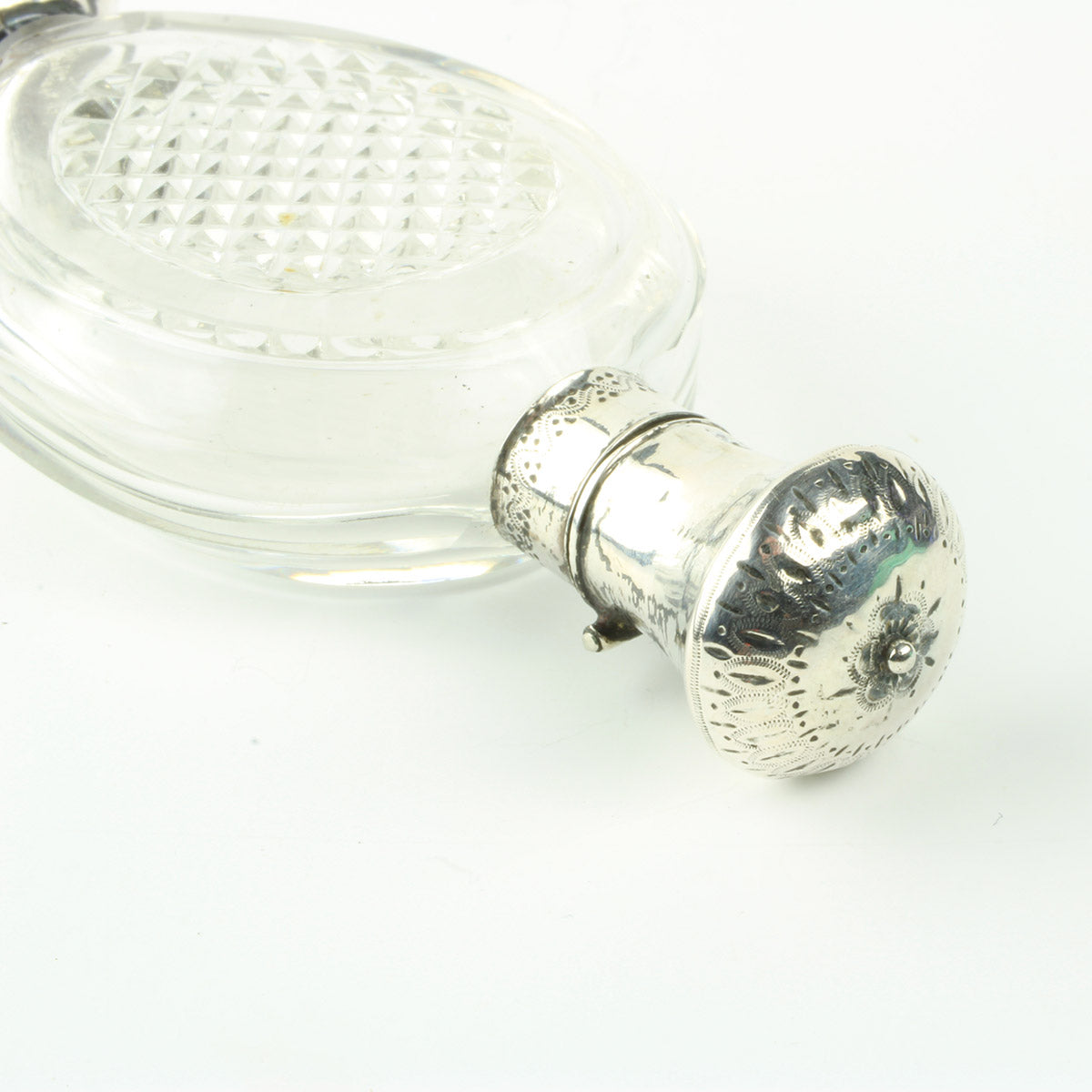 Beskrivelse: Parfume flaske af fuldslebet krystal glas med sølvmontering. Parfume flasken er omvendt dråbeformet på fin lille fod med flot drevet og ciseleret lågmontering i mange fine detaljer. I bunden utydeligt mesterstempel.