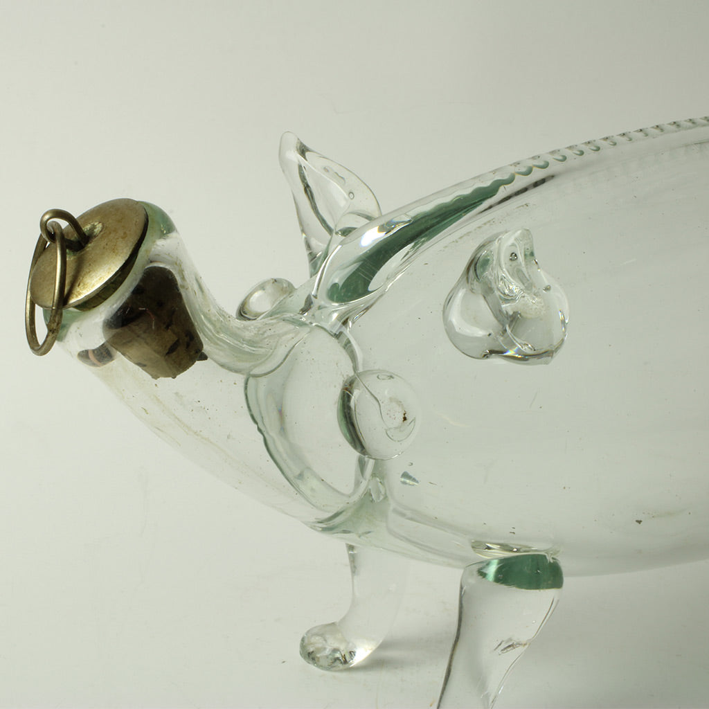 Beskrivelse: Snapsegris fremstillet på Holmegaard Glasværk med påsat hale, ben, ører, øjne og tryne med hul og prop.