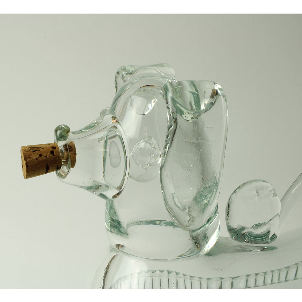 Beskrivelse: Snapsehund fremstillet på Holmegaard Glasværk med påsat hale, ben, ører, øjne og snude med hul og prop.