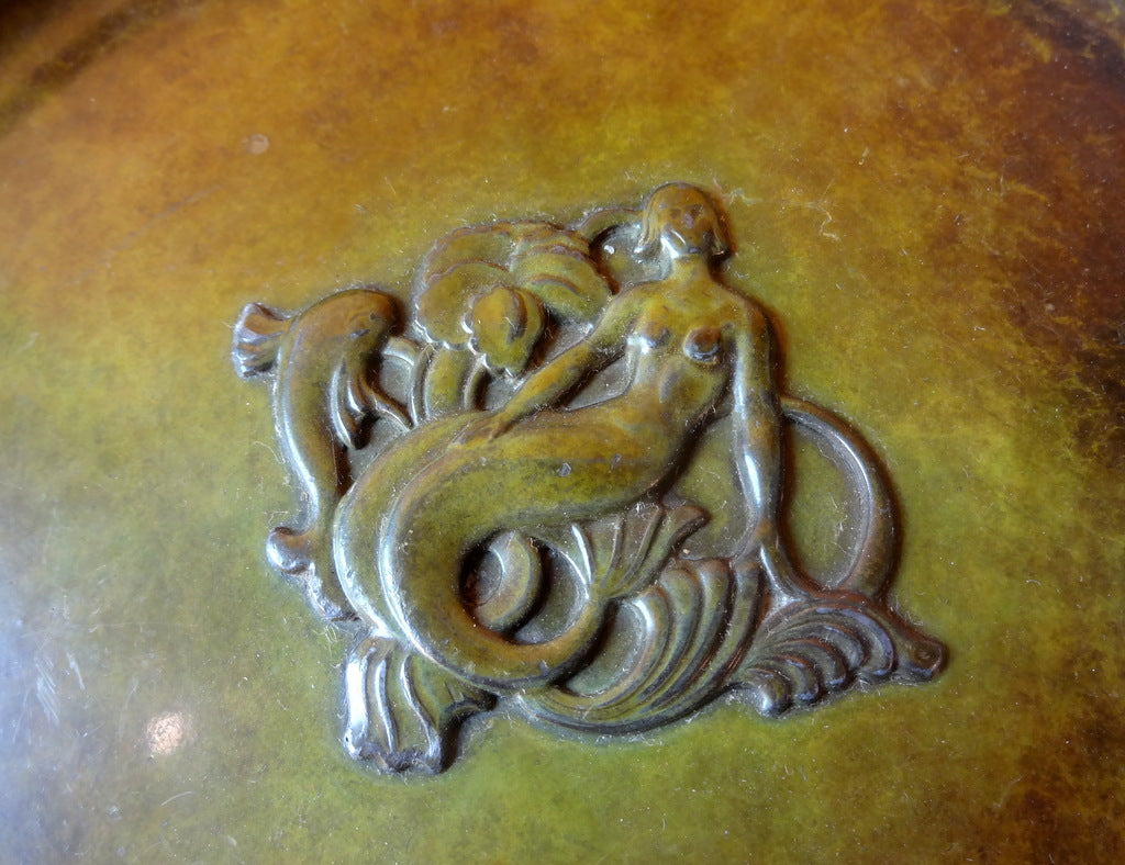 Beskrivelse: Art deco bronze fad, med motiv af havfrue og delfin, stemplet Just Andersen Danmark, nr. 1837.