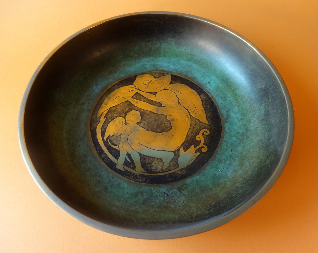 Beskrivelse: Art deco bronze skål, med motiv af kvinde og engel, mindre indgravering i bunden, stemplet Just Andersen Danmark, nr. B49.