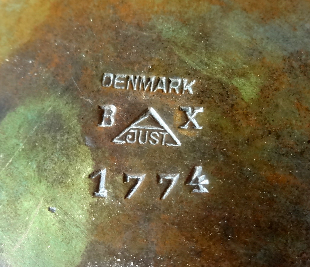 Kunstner: Just Andersen År: ca. 1930 Beskrivelse: Art deco bronze skål, kraftig skål af patineret bronze, stemplet Just Andersen Denmark, nr. 1774. Stativ: let at bruge patina, mindre ridser og mærker ellers fin stand. Mål: Diameter: 20 cm