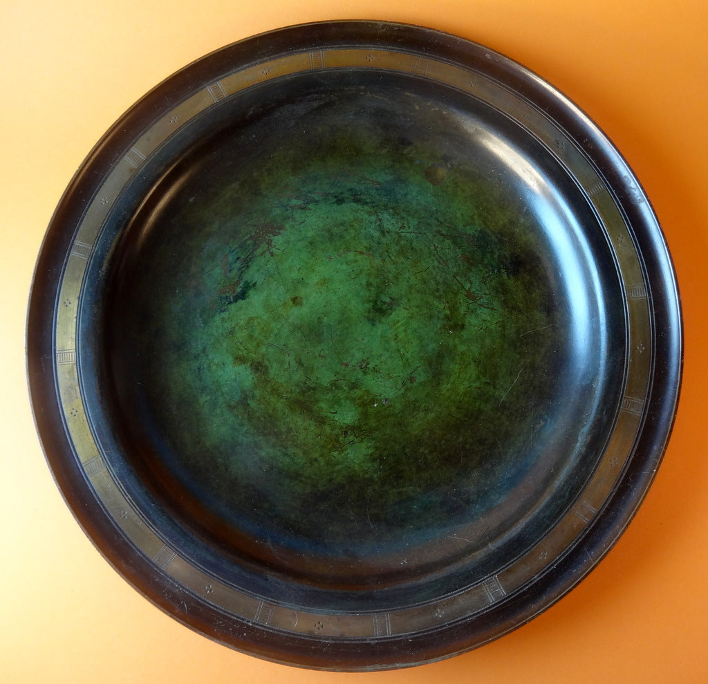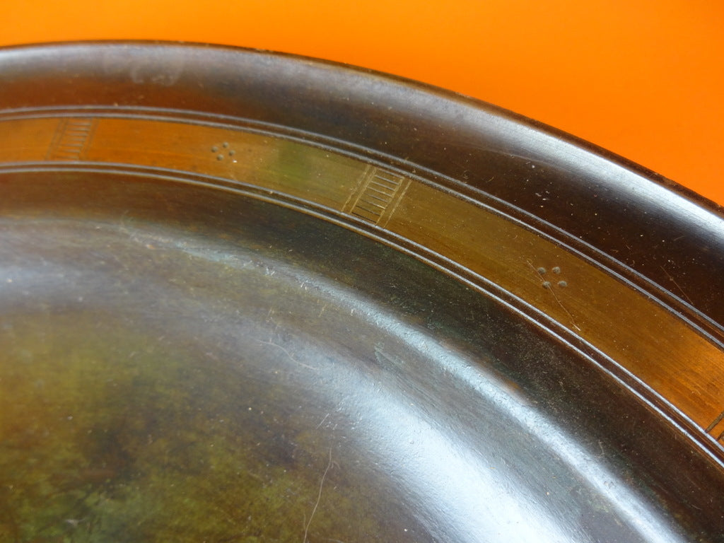 Beskrivelse: Art deco bronze skål, kraftig skål af patineret bronze, delvis forgyldning, stemplet Just Andersen Danmark, nr. 2079.