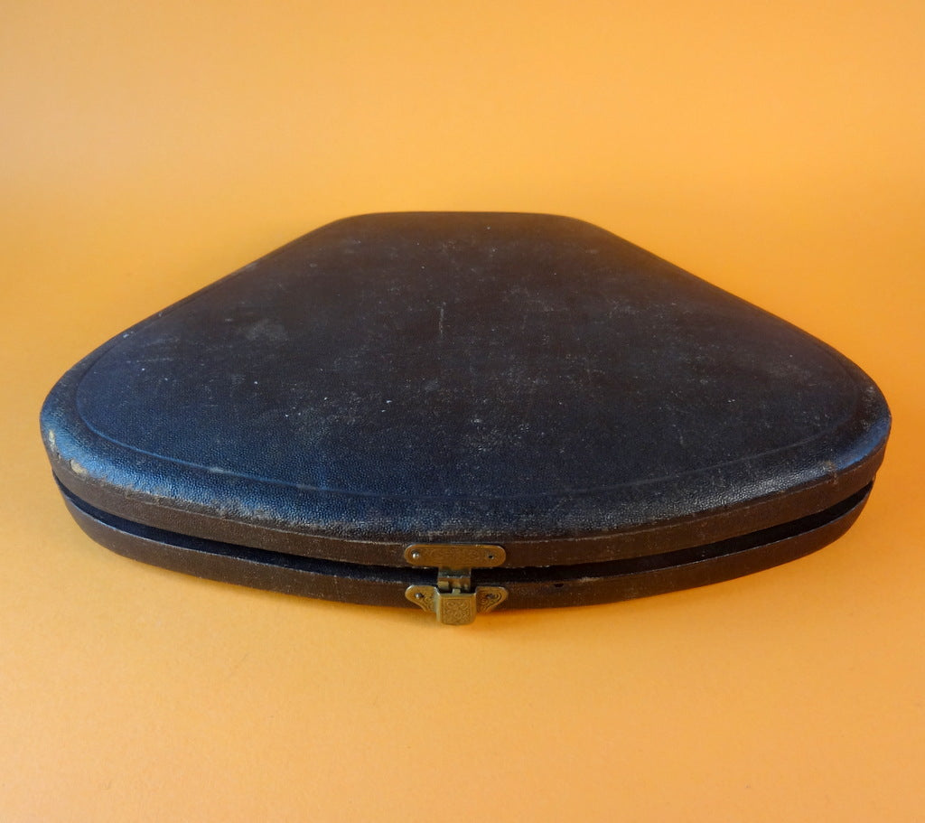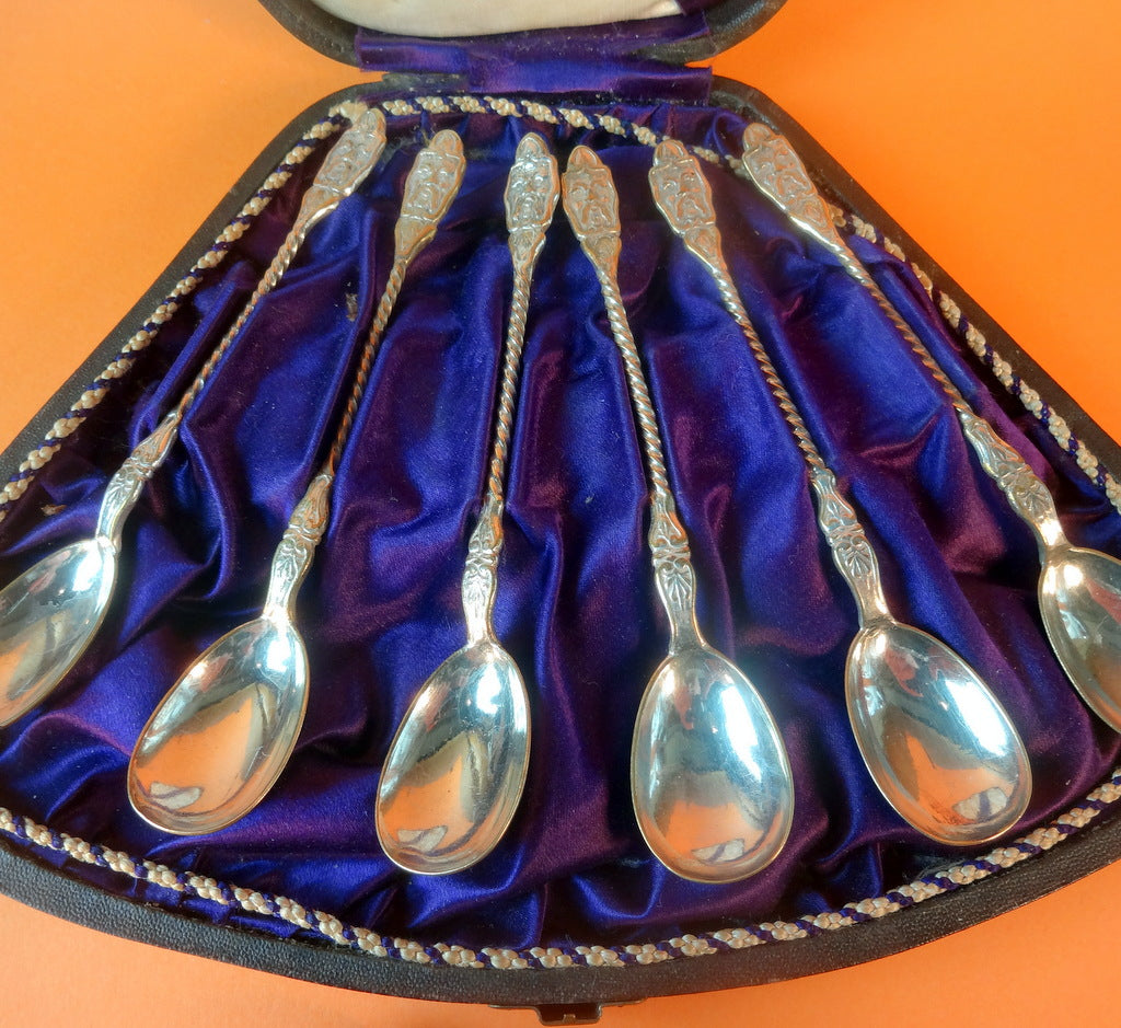 Beskrivelse: Muslingeformet æske af træ. Udvendigt beklædt med kunstlæder, indvendigt med silke, indeholdende seks kaffe skeer af sølvplet. L: 11,5 cm (ske)