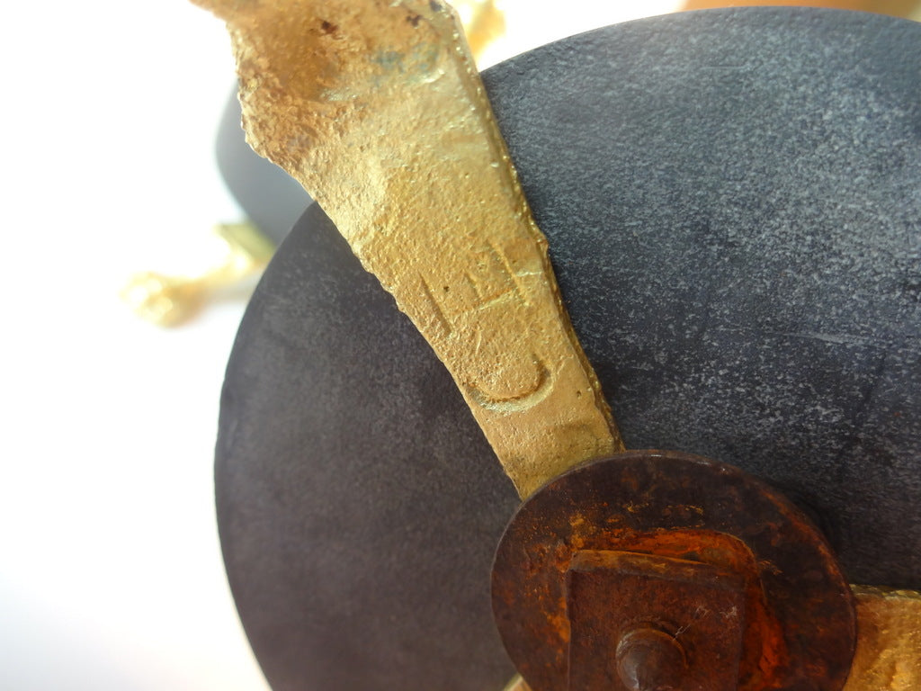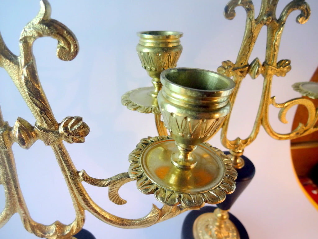 , Årstal: ca. 1880.Beskrivelse: Et par kandelaber i senempire stil, fremstillet af forgyldt bronze. Monteret med sort stenart. I bund signeret CE418, antagelig franske. Højde: 33 cm.