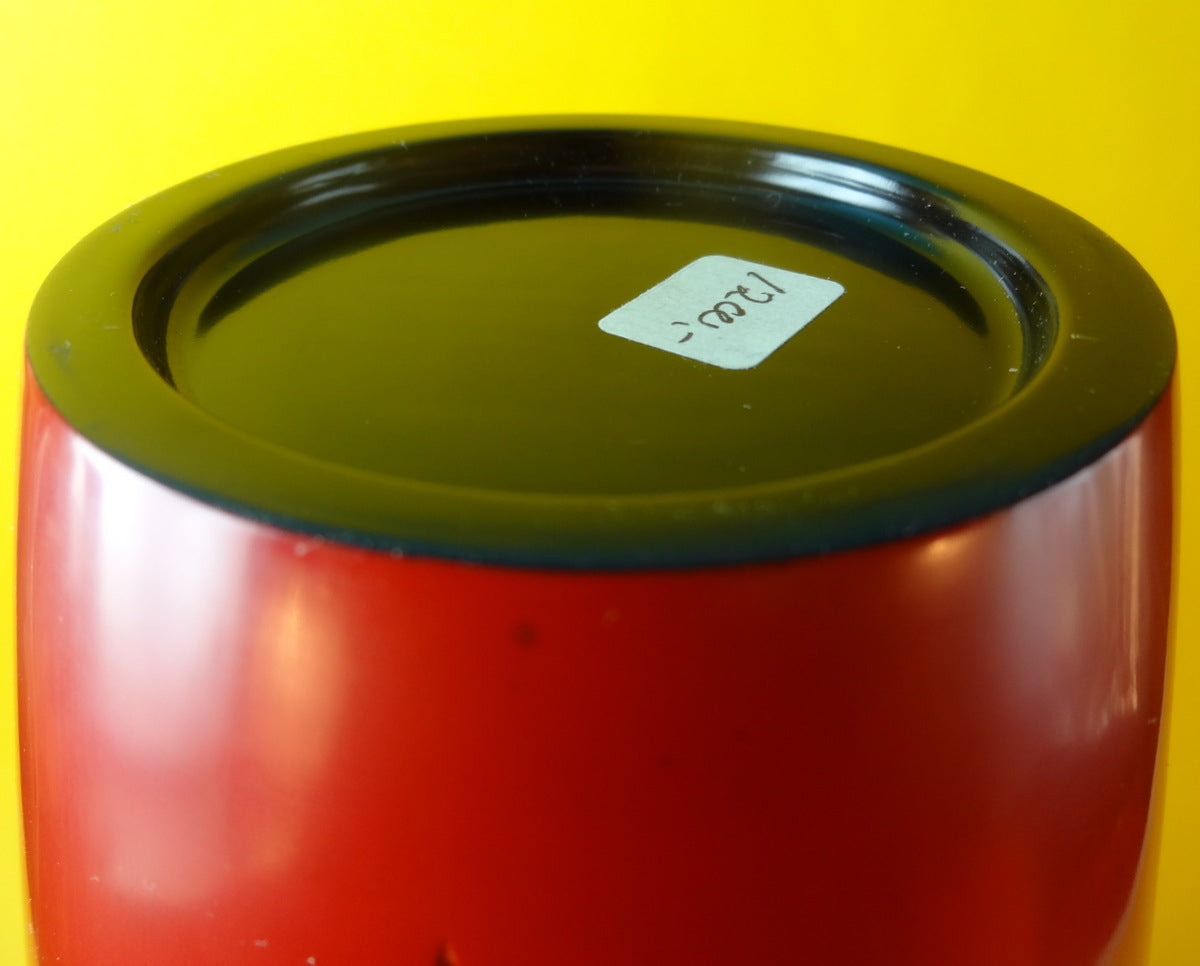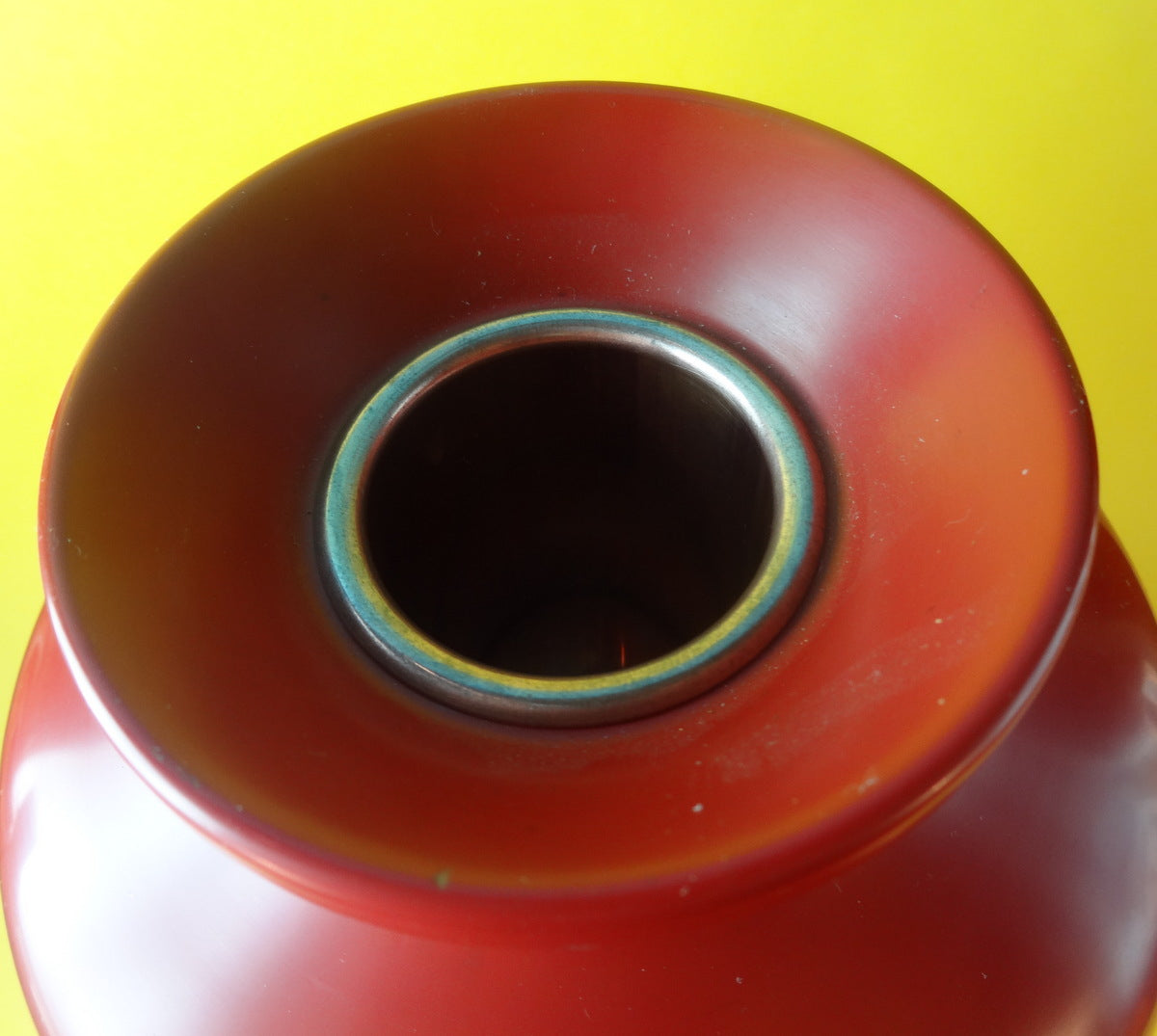 Beskrivelse: Kinesisk vase af cinnabar (rød lak) lavet på korpus af drejet træ, med indsats af forgyldt kobber.