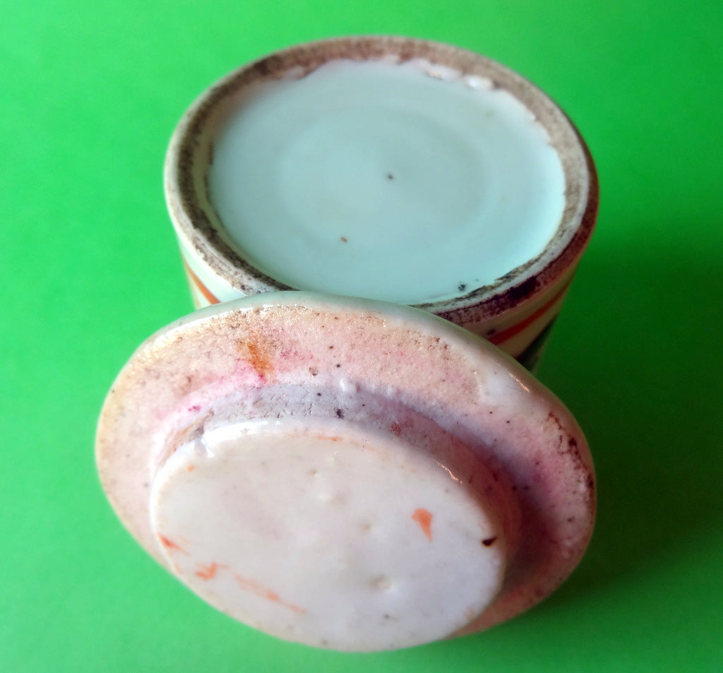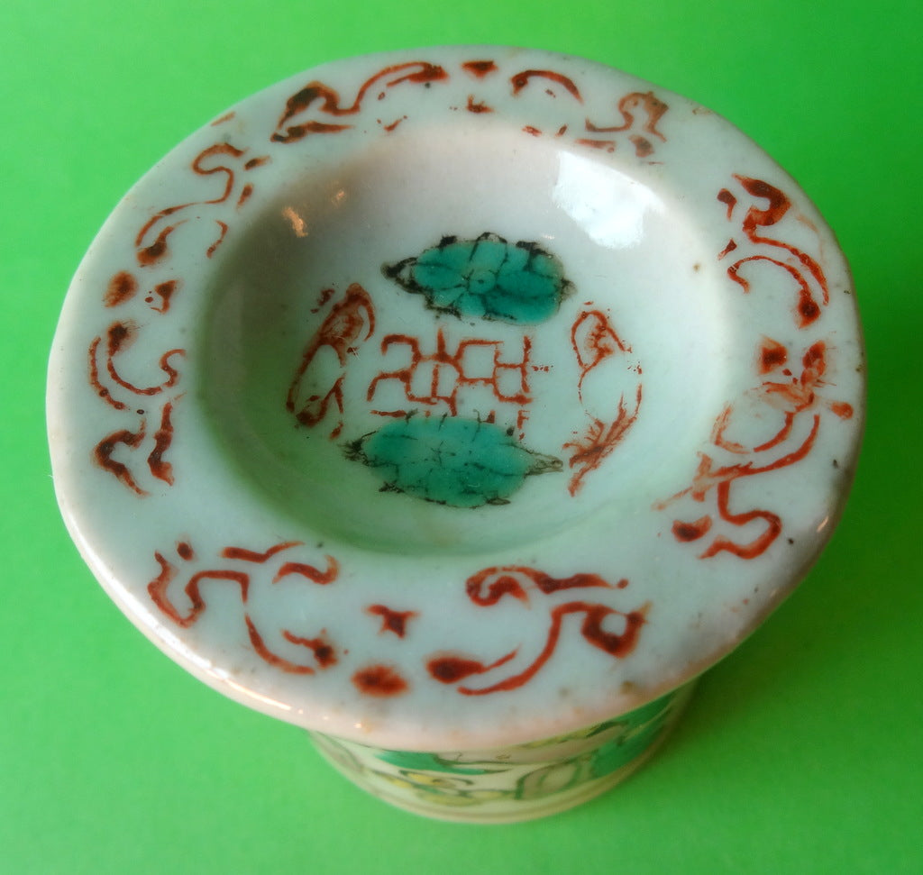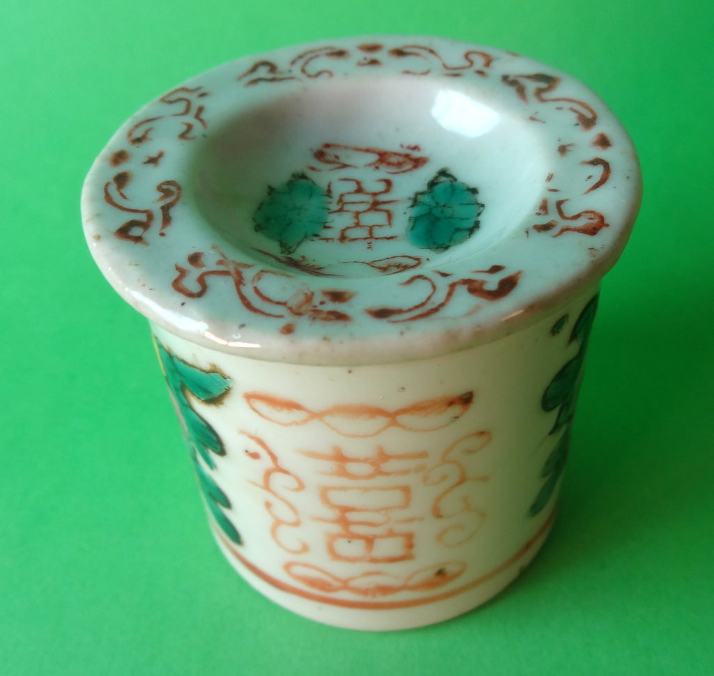 Beskrivelse: Kinesisk salvekrukke af porcelæn med lykkesymbol, og motiv af blomster.
