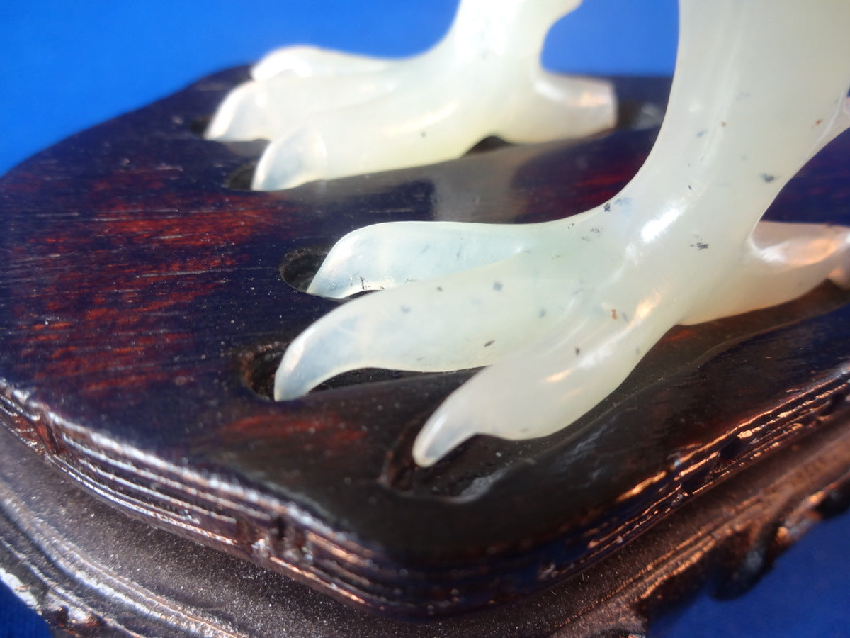 Beskrivelse: To kinesiske haner, udskåret af jade med tilhørende fodstykker af træ.