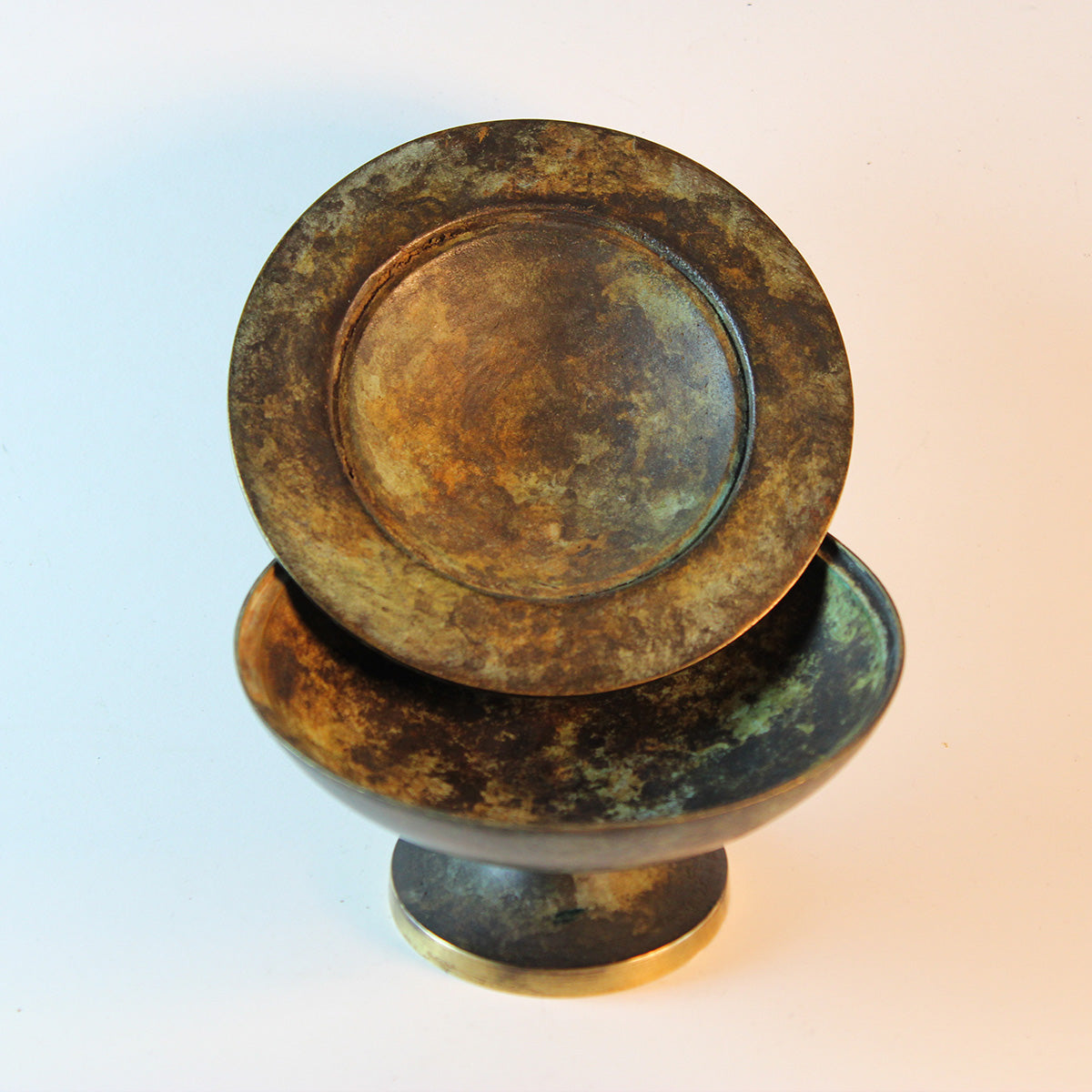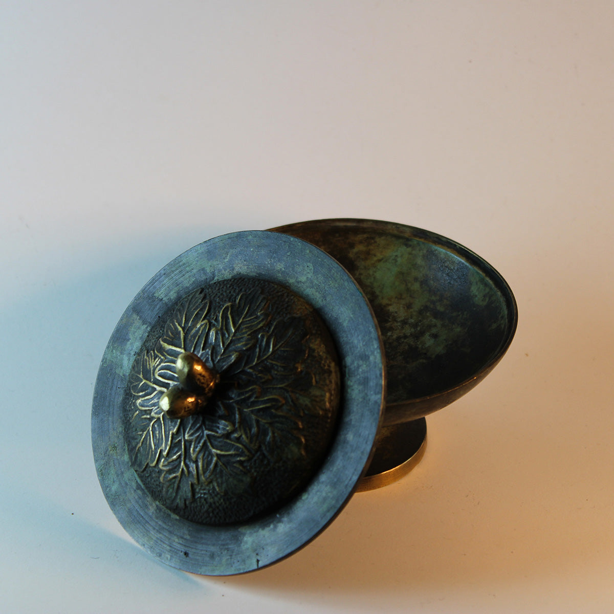 Beskrivelse: Lågskål af patineret bronzemalm med motiv på låg, af egeblade og agern. Særdeles gedigent arbejde.