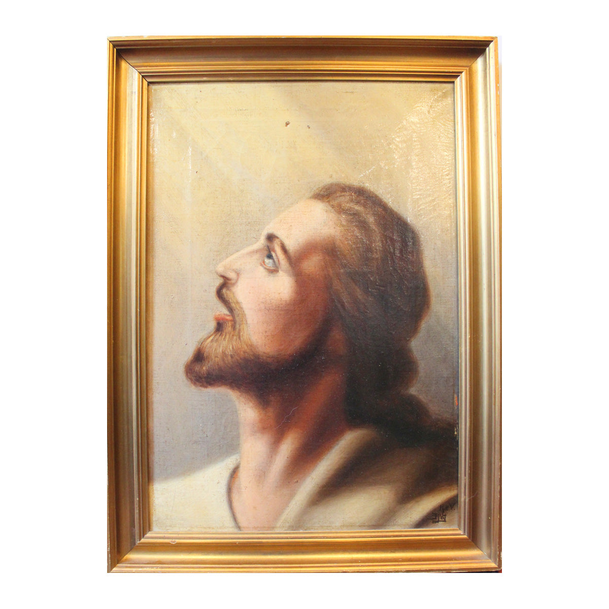 Beskrivelse: Oliemaleri på lærred forestillende Jesus med løftet åsyn betragtende lysindfald fra oven sandsynligvis himmelsklys. Maleriet er signeret Ke V. samt monogram JP 04.