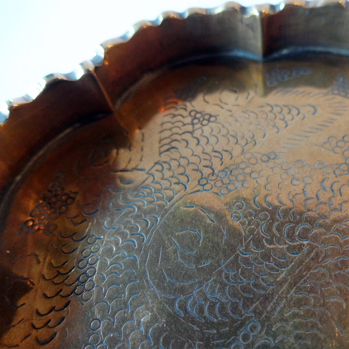 Beskrivelse: Lille kinesisk bakke af messing, særdeles kraftig kvalitet. Bakkens form er bølget rund med høj kant. Indvendig med motiv af drage og skyer. Den lille bakke er usædvanlig i størrelse. 93 gr.
