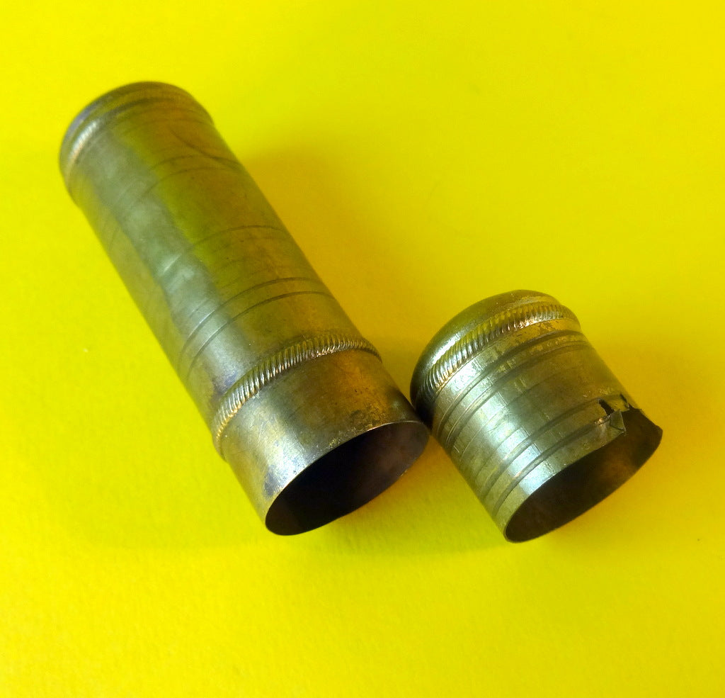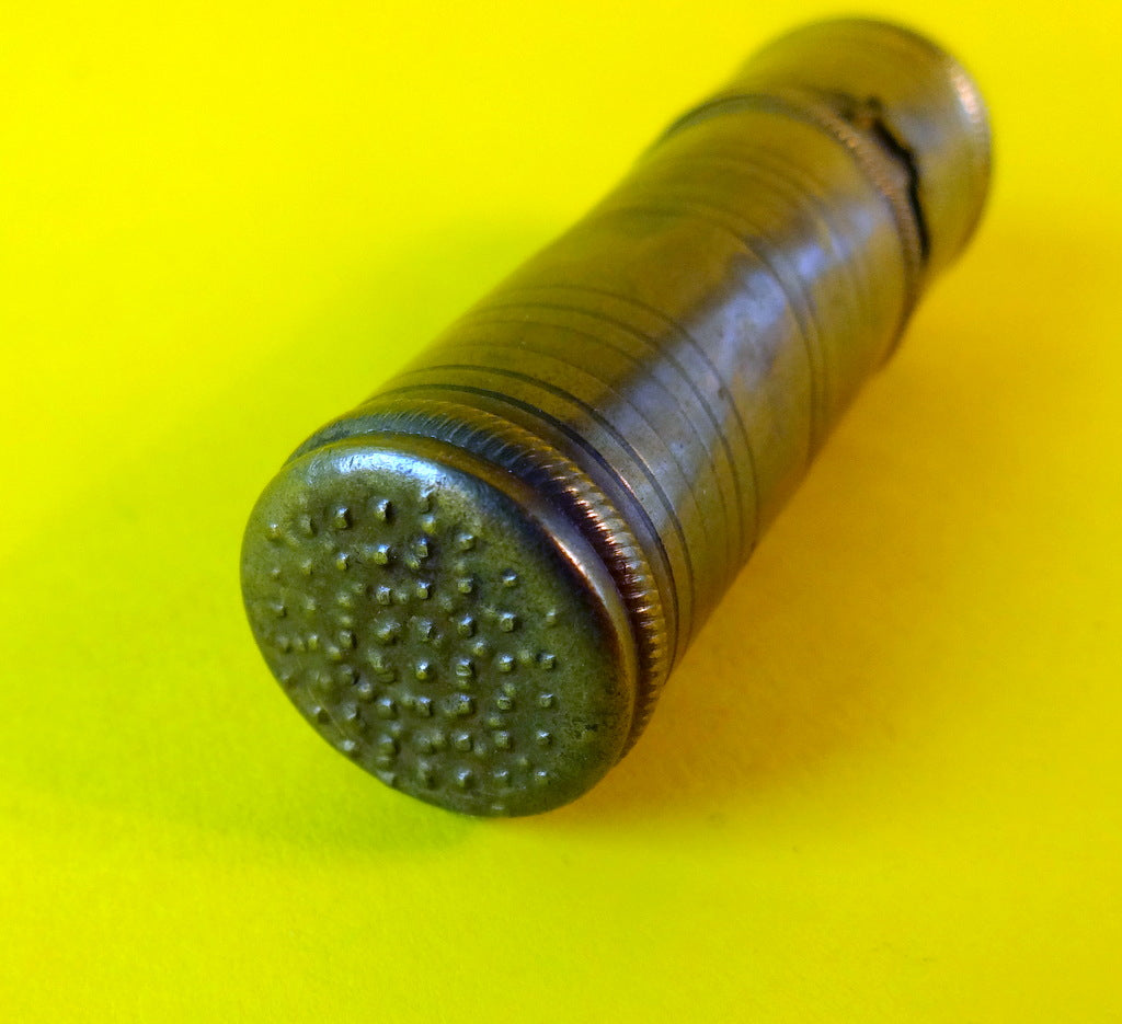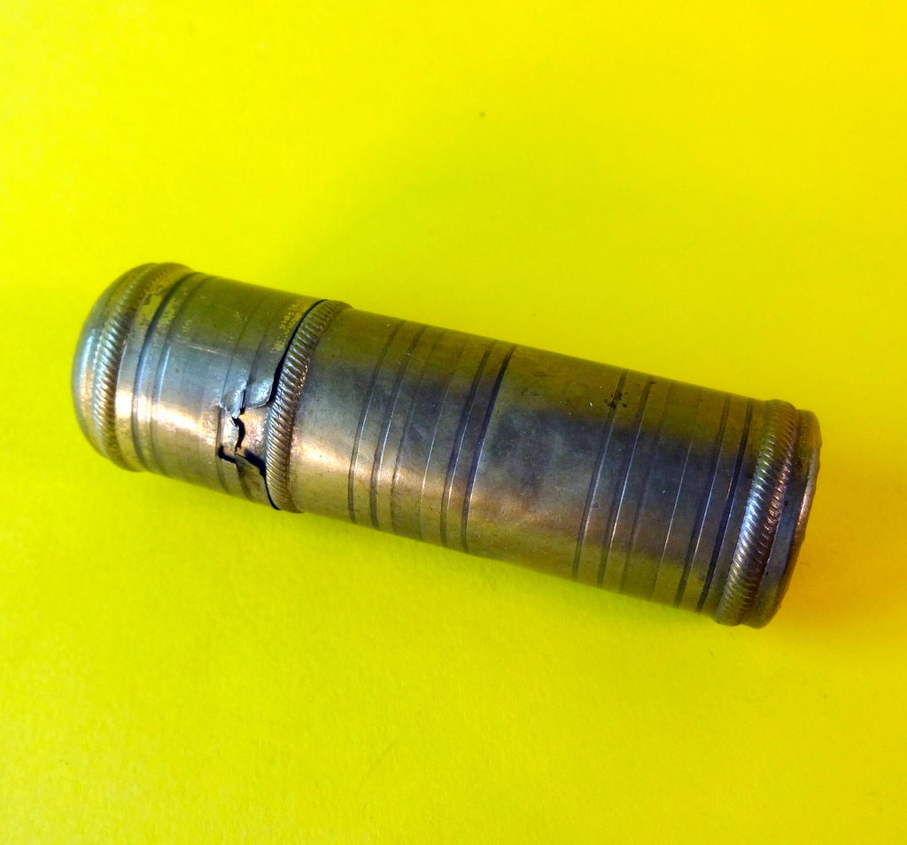 Beskrivelse: Hylster af messing til opbevaring af datidens tændstikker. Højde: 6,5