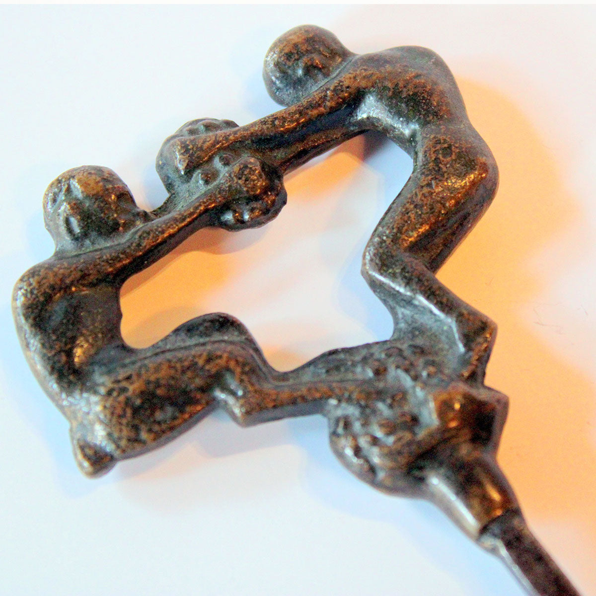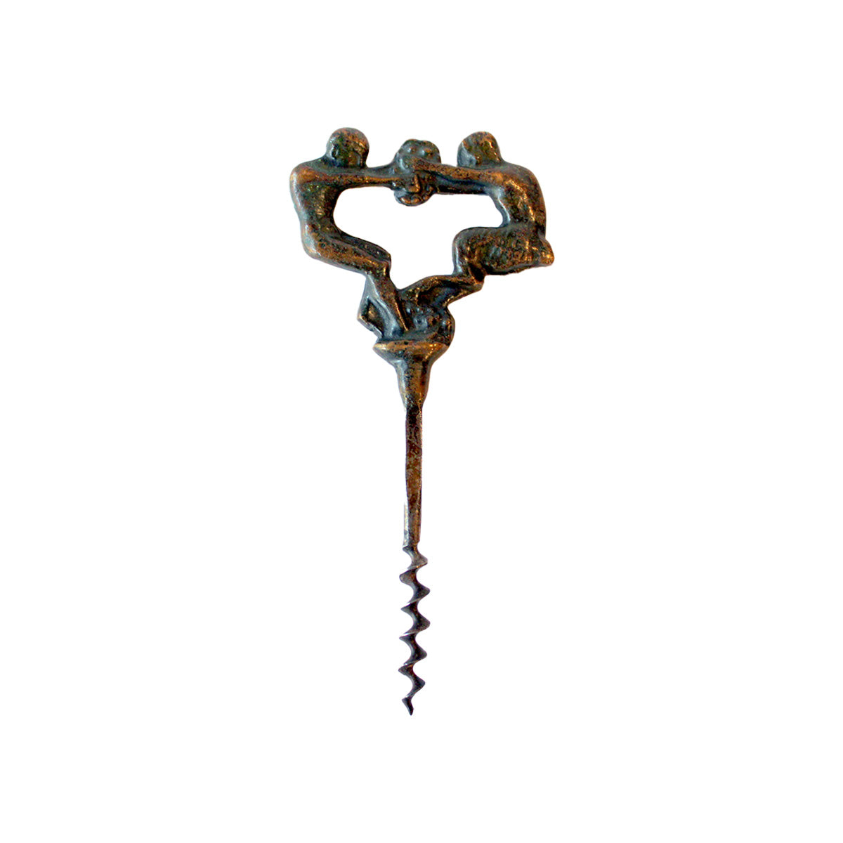 Beskrivelse: Proptrækker designet af Mogens Ballin forestillende mand og satyr/favn der slås om en drueklase. Proptrækkeren er fremstillet omkring 1920 af Hertz og Ballin.127gr.