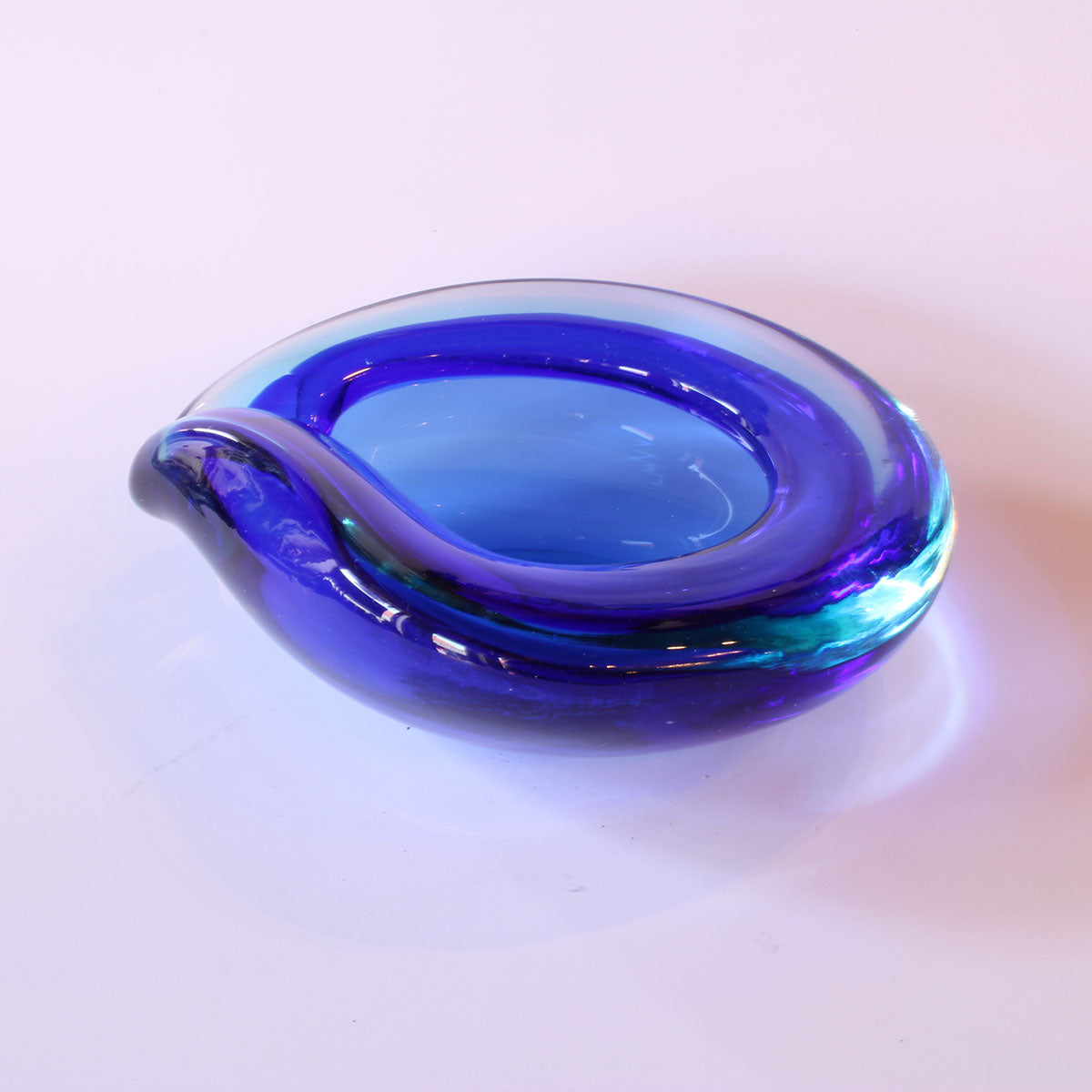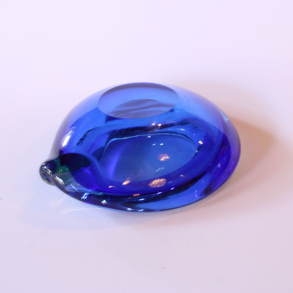 Beskrivelse: Lille dråbeformet glasskål fra Venedig/Murano i blåt glas med havgrøn overfang. Skålen er fremstillet i ca. 1970.