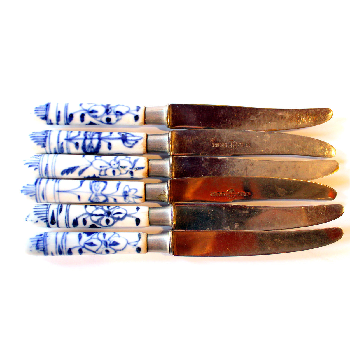 Beskrivelse: Seks frugtknive med skafte af musselmalet porcelæn, monteret med forniklet bronze kniveblade. Knivbladende er stemplet STAHL bronce, i midten logo med flyvemaskine.