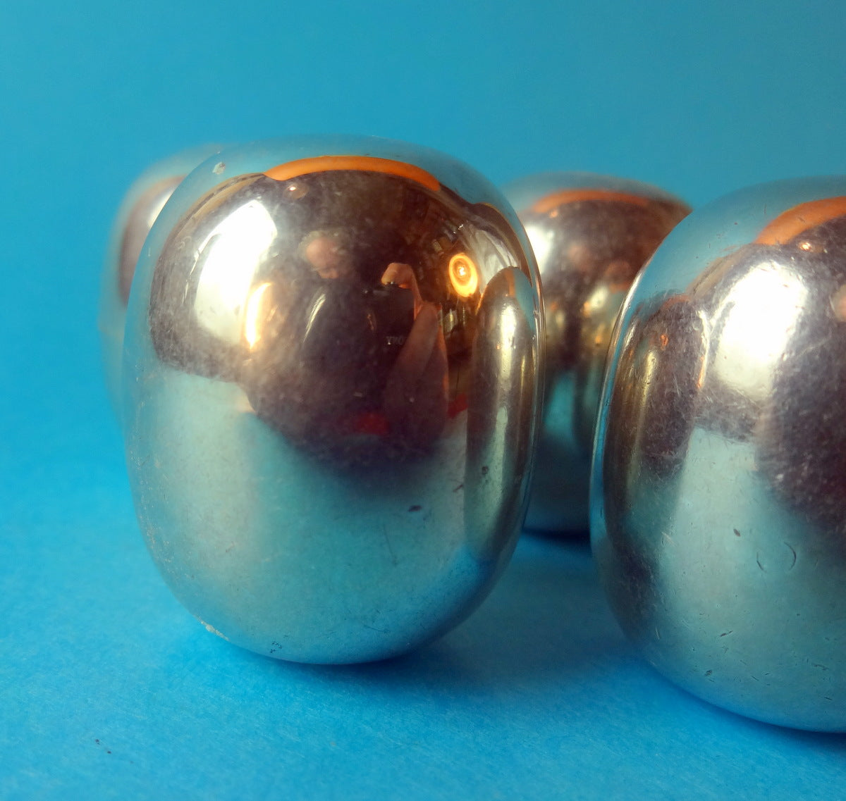 Beskrivelse: Seks forsølvede Piethein elipseæg indeholdende kølervæske. Æggene anbringes i dybfrosseren, og anvendes som isterninger, således at fx whiskey ikke spædes op med vand.