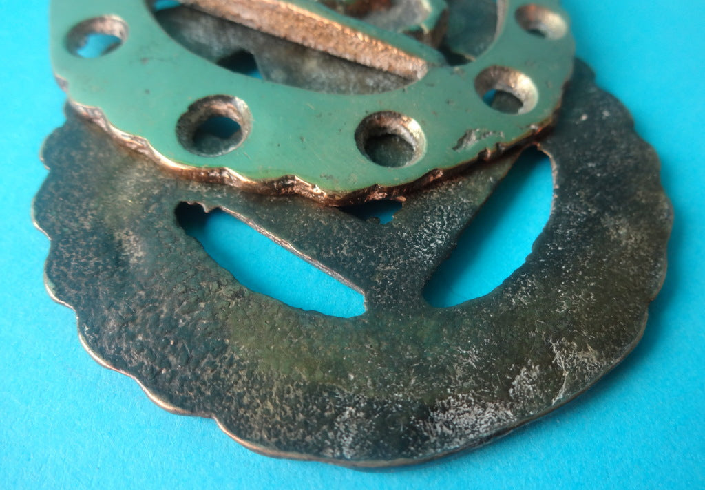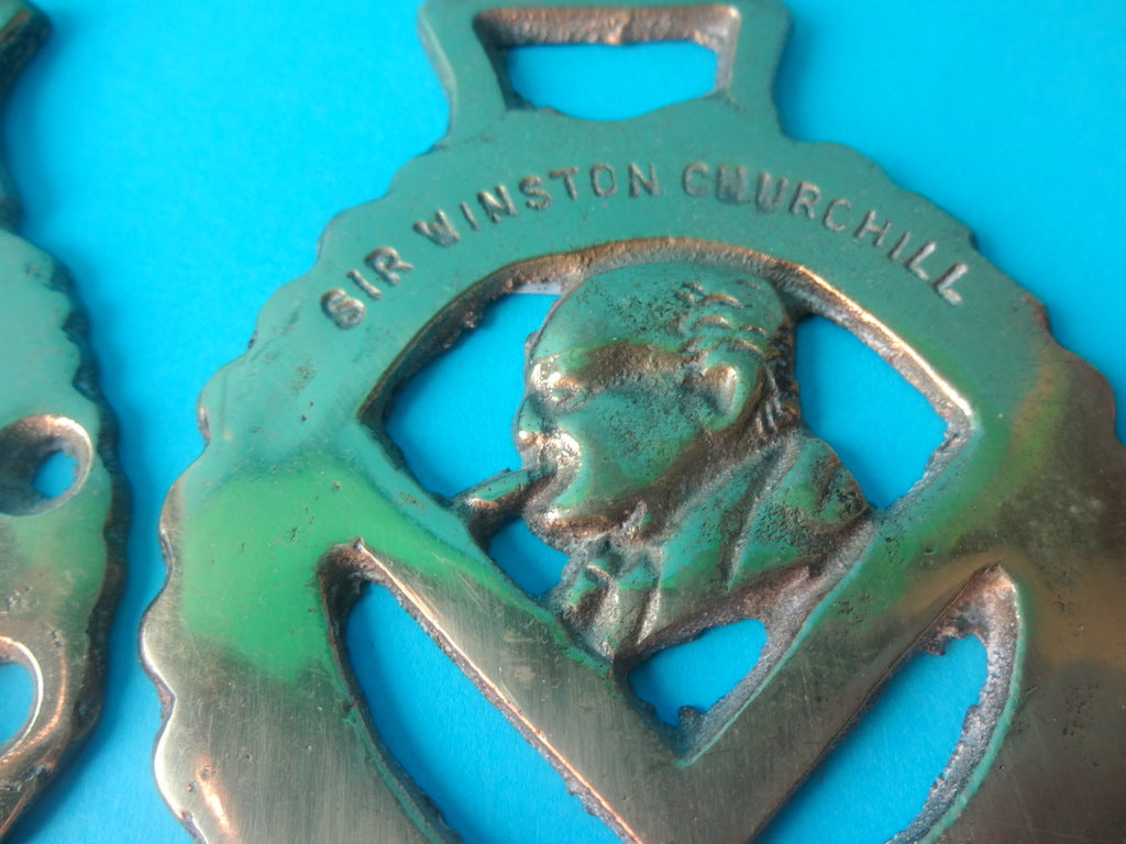 Beskrivelse: To pyntespænder til hesteseletøj i messing, den ene forestillende tyr og den anden Winston Churchill.