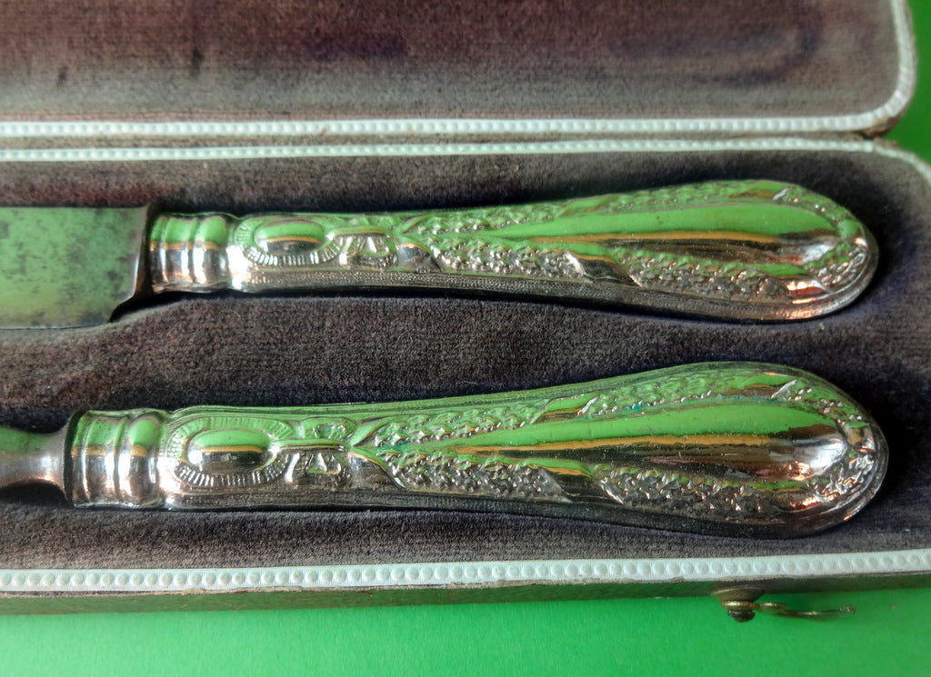 Beskrivelse: Etui med rejsebestik, kniv og gaffel. Håndtag i tyndt sølvblik, udfyldt med schellak. Selve bestikket i jern.