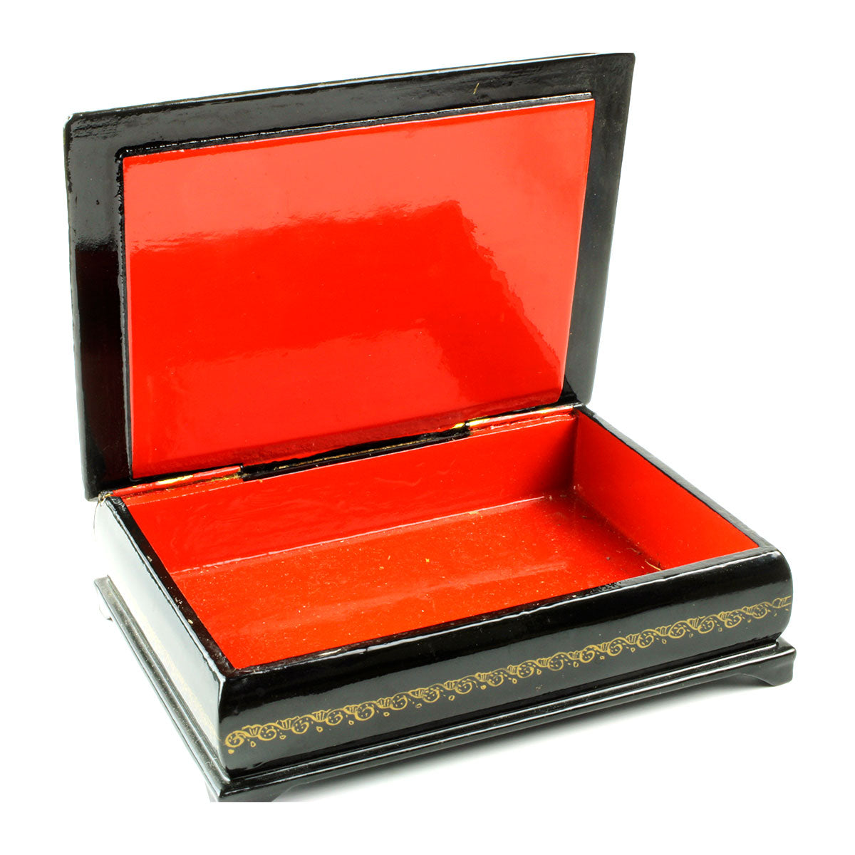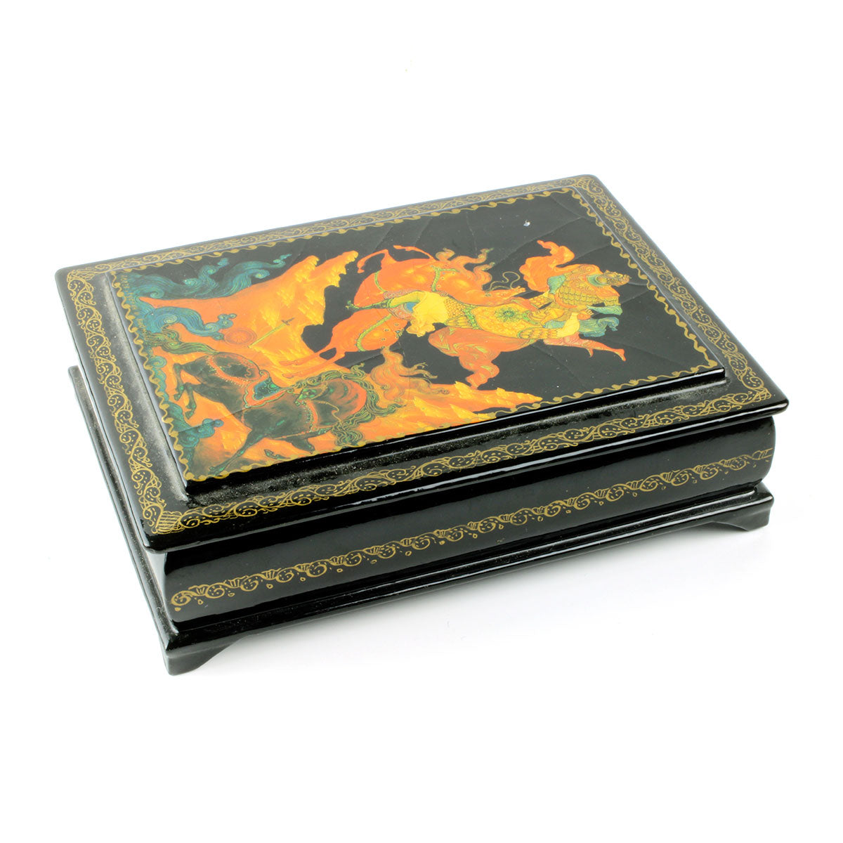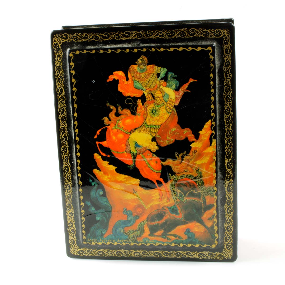 Beskrivelse: Russisk lakæske fremstillet af træ ca. 1970 med motiv af krigere og heste på sort baggrund. Den russiske lakæske er signeret i bunden og indvendigt malet rød.