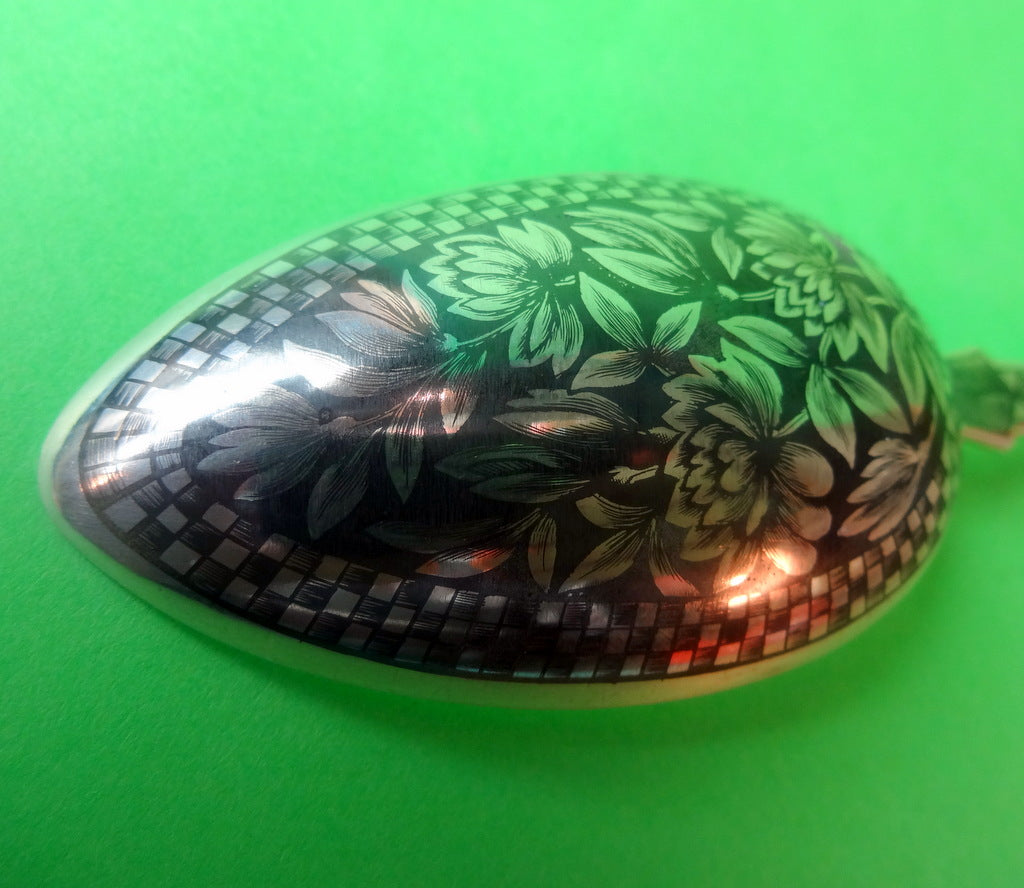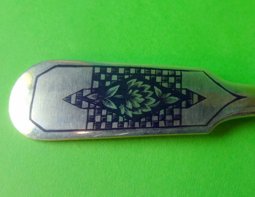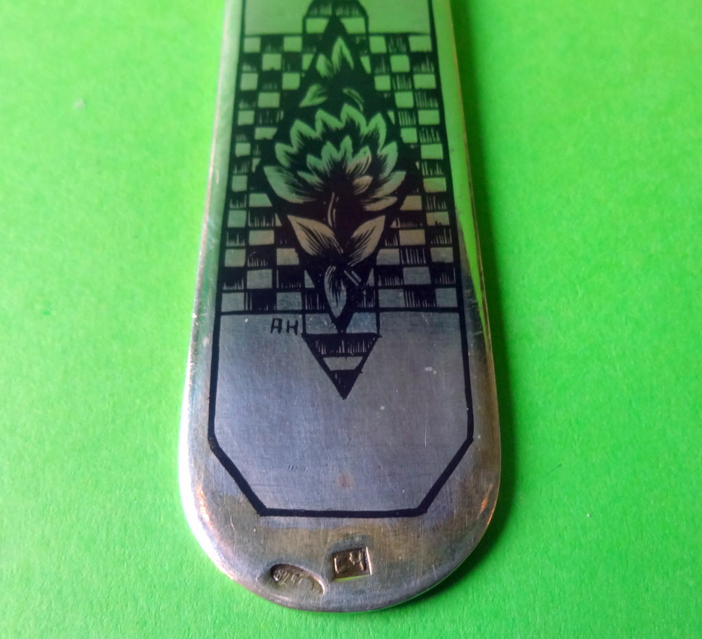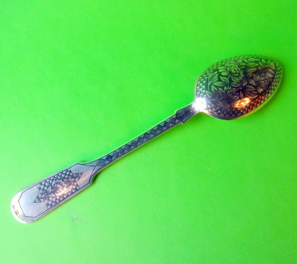 Beskrivelse: Russisk ske af sølv, stemplet 875 samt ukendt mestermærke. Forgyldt laf, Niello arbejdet signet AH
