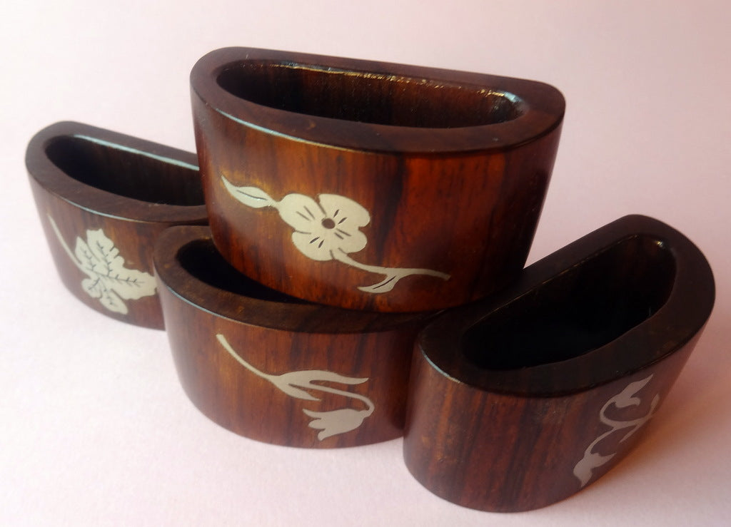 Beskrivelse: 4 servietringe af udskåret palisander, med indlagte blomster motiver af sølv.
