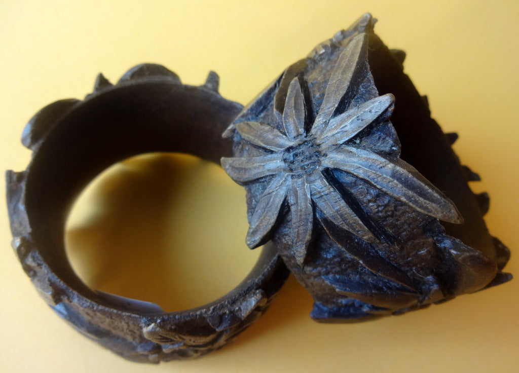 Beskrivelse: To servietringe af udskåret hård træsort, antagelig syd-Tyskland eller Østrig. Motiver af ædelvejsblomster.