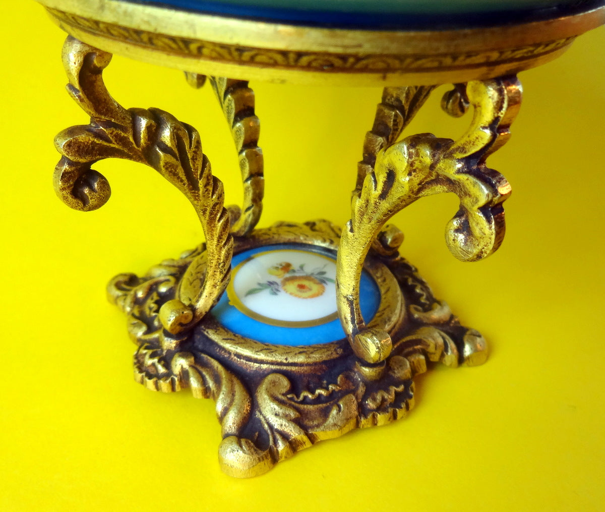 Beskrivelse: Sevres bordskål af porcelæn, monteret med forgyldt bronze. Skålen med overførsel overført motiv, i bund plakette med blomster.