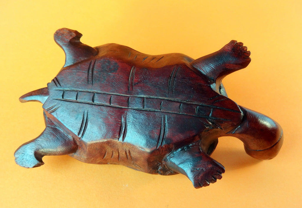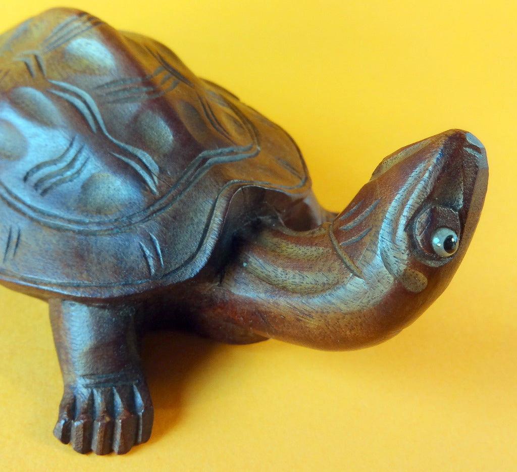 Beskrivelse: Kinesisk figur af rosentræ, forestillende skildpadde med hovedet strakt. I sat øjne af glas. Længde: 15 cm