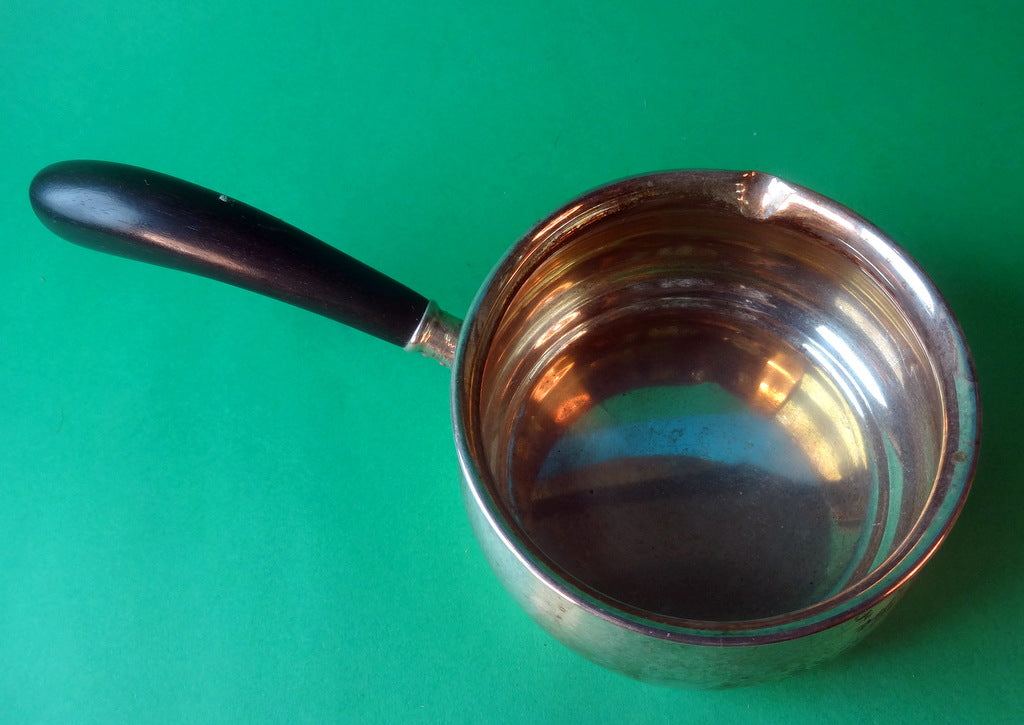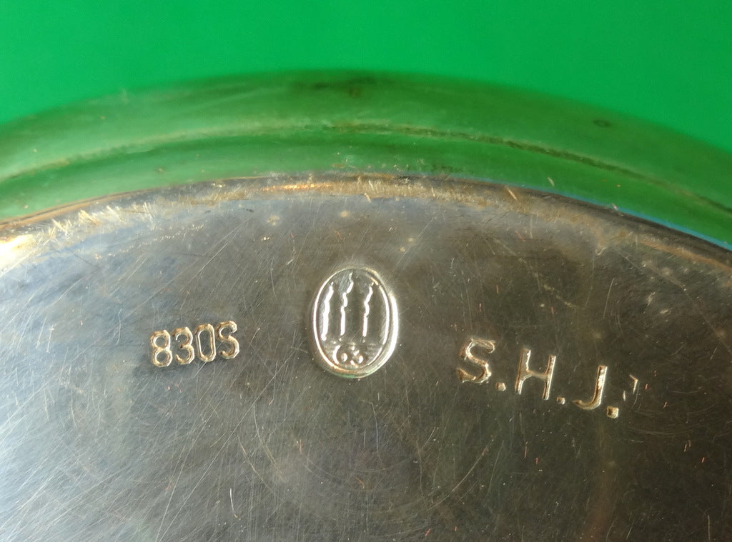 Beskrivelse: Smørnæb af tretårnet sølv, med hank af hårdt sort træ. I bund stemplet 830S, samt tretårne med årstal og S.H.J, for sølvsmeden.