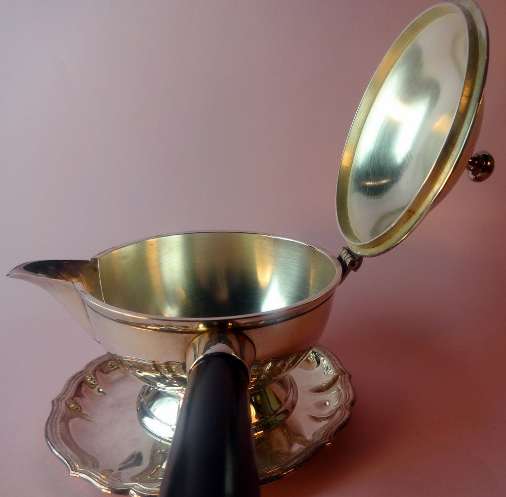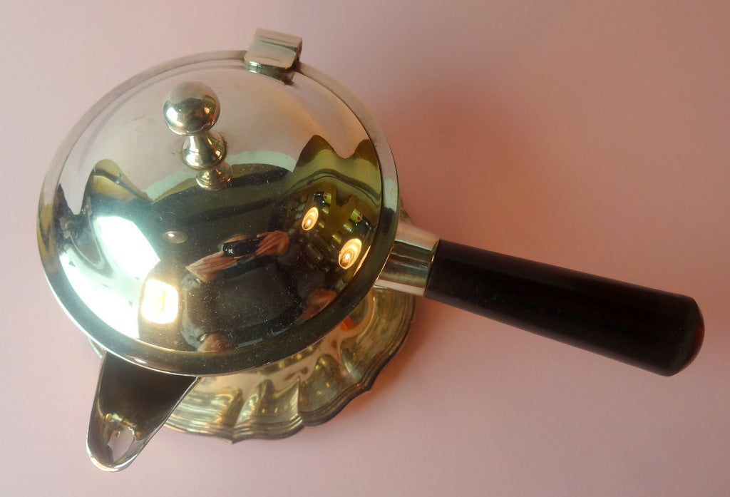 Beskrivelse: Lille terrin med håndtag af bakkelit, sølvplet.
