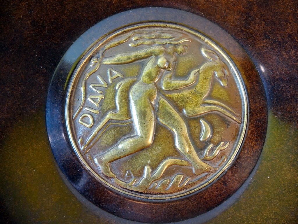 , Årstal: ca. 1930.Beskrivelse: Stort bordfad fra Ystad brons i midten monteret med plakette af jagtgudinden Diana. Signeret A. D: 40 cm