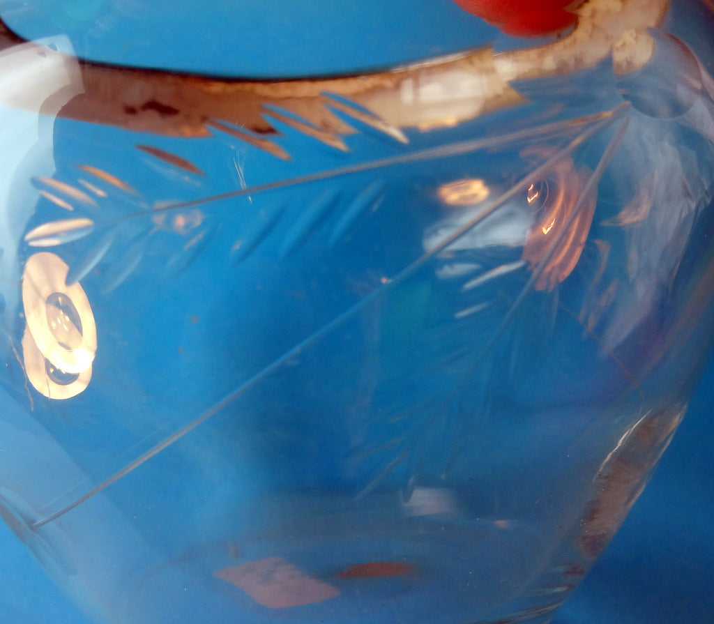 Beskrivelse: Sukkerskål af glas med slibninger, og montering af sølvplet.