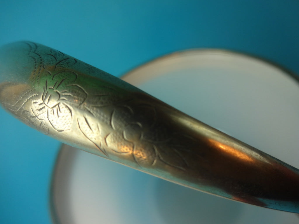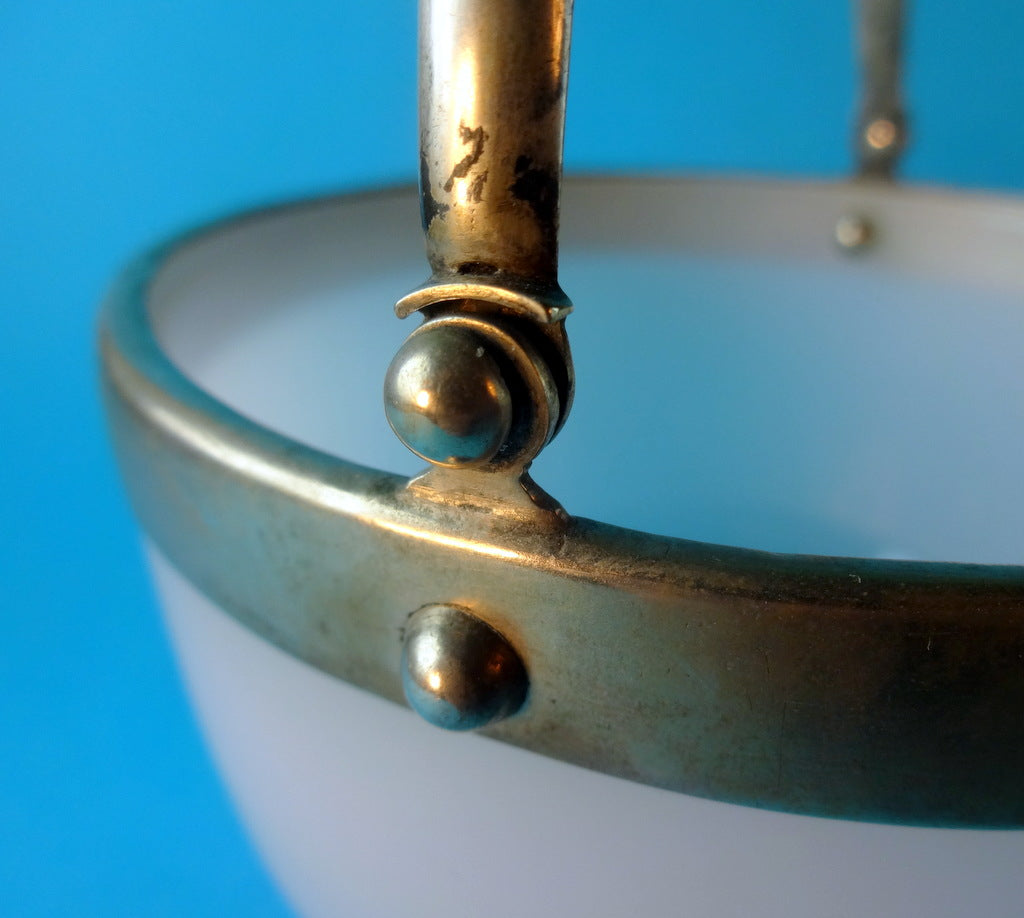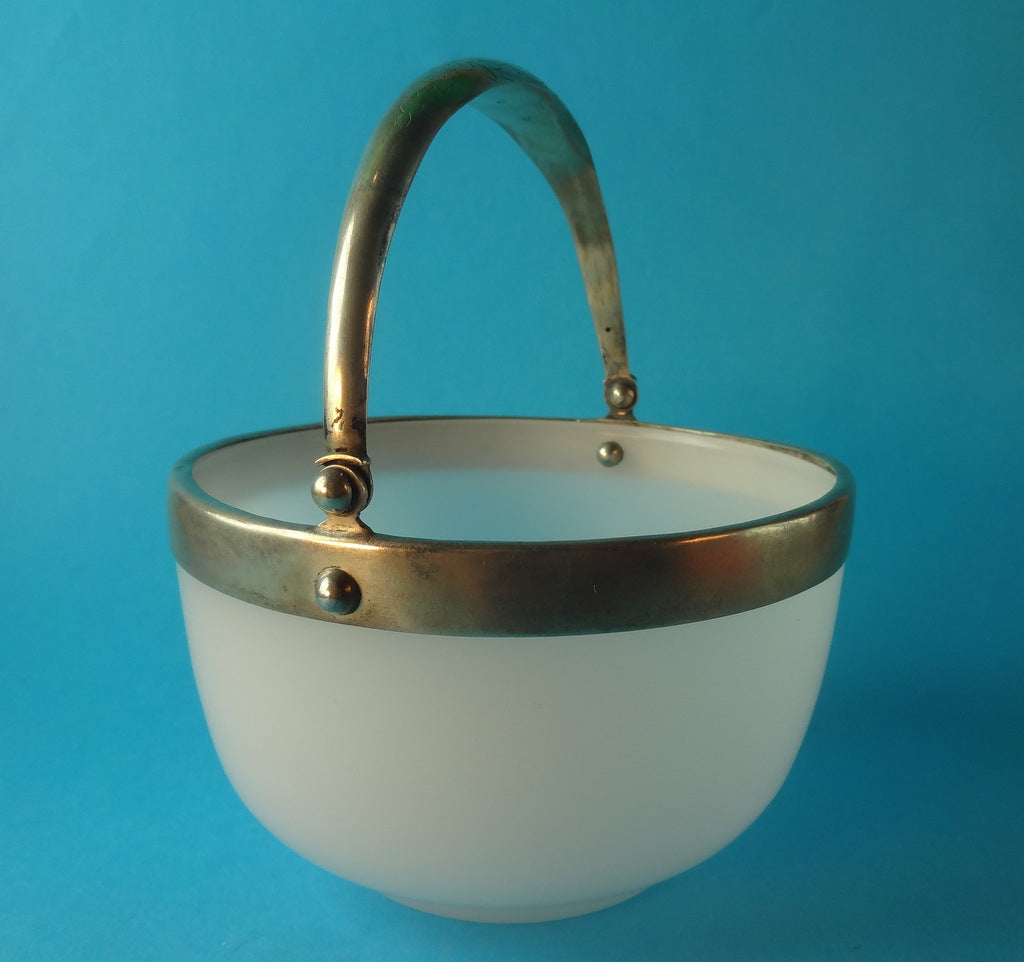 Beskrivelse: Sukkerskål af opalglas, med montering af sølv. På hank graveret blomstermotiv, stemplet under hank.