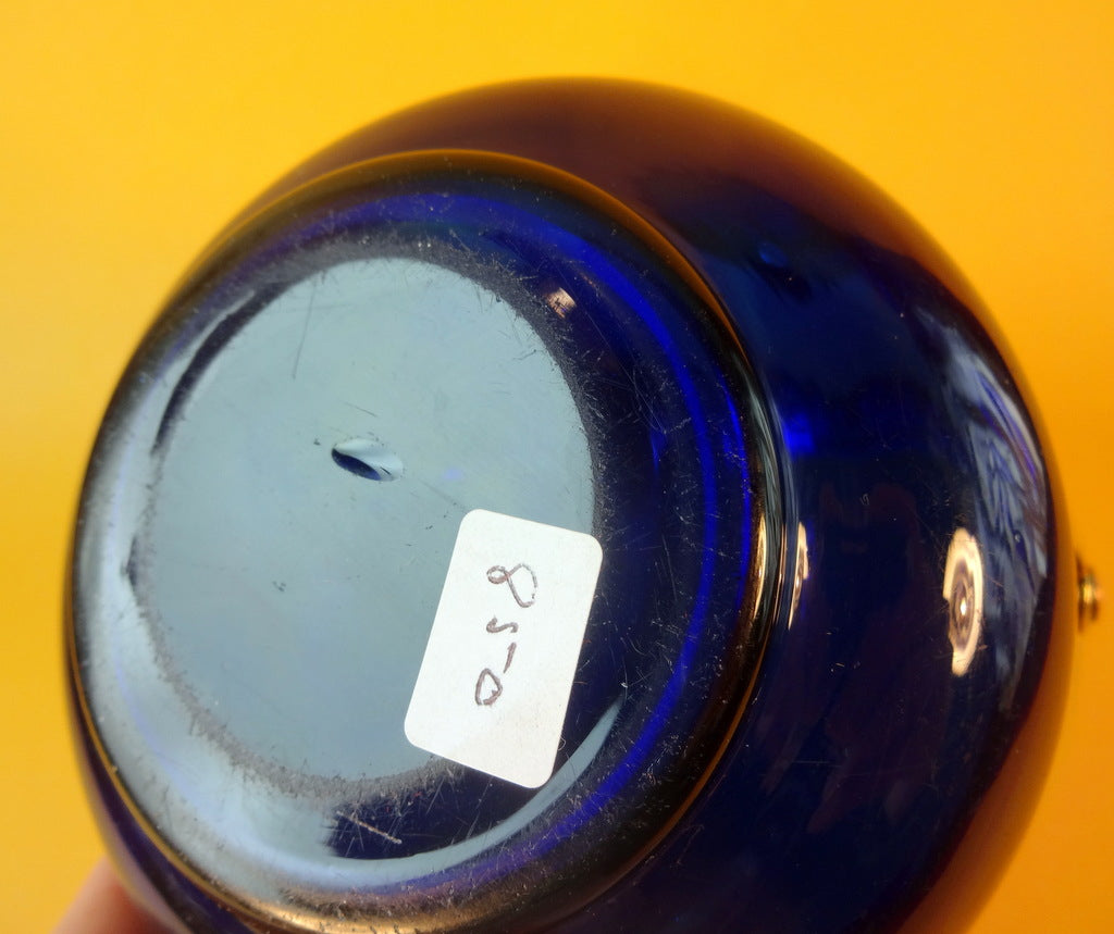 Beskrivelse: Sukkerskål af blåt glas, mundblæst og kugleslebet i bund med messing montering.